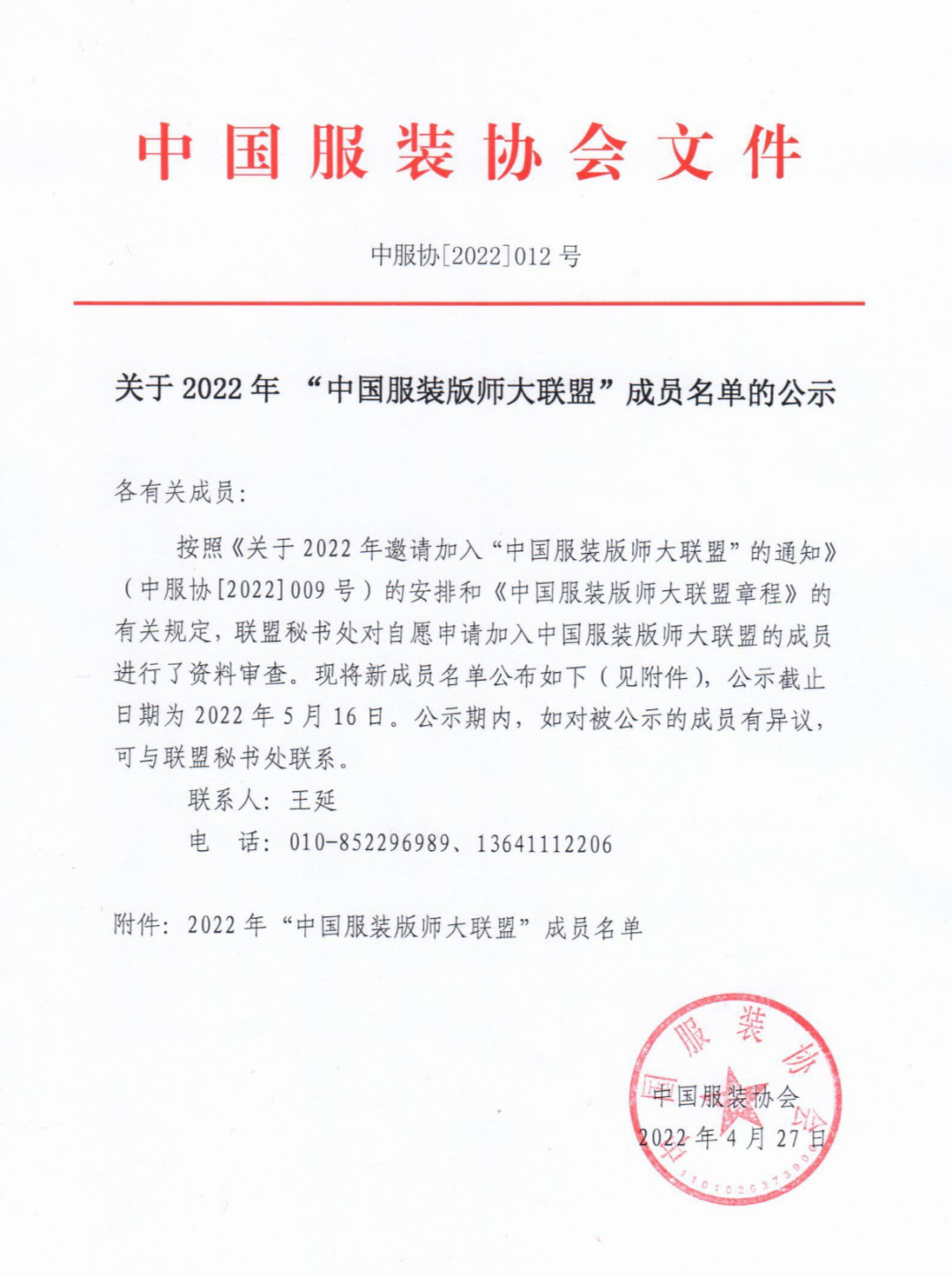 按照《关于2022年邀请加入“中国服装版师大联盟”的通知》(中服协[2022]009号)的安排和《中国服装版师大联盟章程》的有关规定,联盟秘书处对自愿申请加入中国服装版师大联盟的成员进行了资料审查。现将新成员名单公布如下(见附件),公示截止日期为2022年5月16日。公示期内,如对被公示的成员有异议,可与联盟秘书处联系。