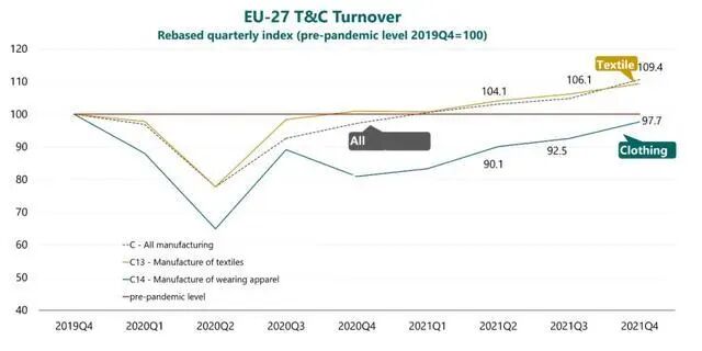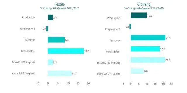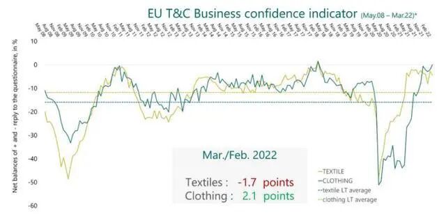 作为数百家领先品牌、国际知名设计师,以及前瞻性企业家、研究人员和教育工作者的家园,欧洲的高品质纺织品和高端时尚产品的需求一直在增长,不仅包括美国、瑞士、日本或加拿大等高收入国家,也包括中国和香港、俄罗斯、土耳其和中东等新兴国家和地区。近年来,欧洲纺织业的转型也使得其产业用纺织品的出口得到持续增长。从2021年全年来看,欧洲纺织行业已经从2020年的强劲收缩中完全恢复,几乎达到了疫情前的水平。然而,由于COVID-19大流行,全球供应链放缓导致全球供应短缺,严重影响到消费者模式。原材料和能源价格的持续上涨对纺织服装行业的影响越来越大。尽管增速低于以往几个季度,2021年第四季度欧洲纺织行业还是得到了进一步扩张,在此期间,服装行业的业绩显著改善。此外,由于内外需求强劲,欧盟出口和零售额持续增长。欧盟27国纺织服装行业营业额(2019年第四季度-2021年第四季度)欧盟纺织和服装2020年和2021年第四季度在生产、就业、营业额、零售、欧盟27国额外进口和额外出口方面的数据对比未来几个月,欧盟的纺织行业商业信心指数略有下降(-1.7点),这很大程度上与当地能源供应不足有关,服装行业对此仍较为乐观(+2.1点)。总体来说,业内人士对纺织品和服装的信心高于长期平均水平,即疫情前2019年第4季度的水平。欧盟纺织服装行业商业信心指数变化(2008年5月-2022年三月)然而,居民对整体经济状况的期望和对未来自身财务状况的评价跌至历史最低,消费者信心指数也随之下降。零售贸易指数与其相同,这主要是由于零售商对其预期业务状况信心不足的原因。自疫情后,欧洲纺织工业重拾了对纺织业的重视,不论是制造过程、研发还是零售都进行了许多变革以保持其竞争力,大部分欧盟国家的纺织工业已转向生产附加值更高的产品。随着能源成本的降低和原材料的增加,未来欧盟纺织服装行业的销售价格预计会升至前所未有的水平。