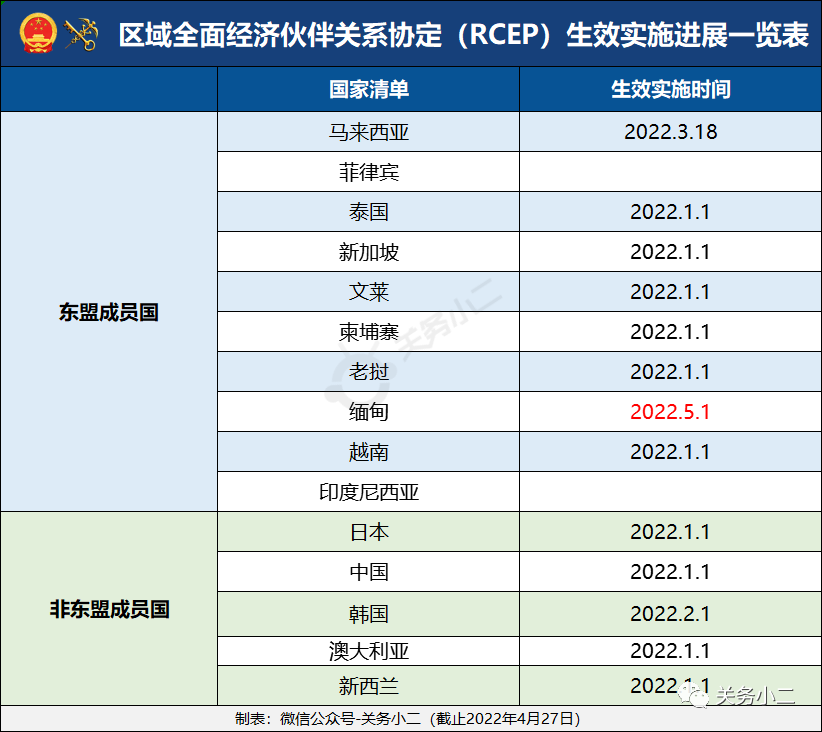 点击蓝字关注我们2022年5月1日起,缅甸对RCEP各成员国实施RCEP协定生效...