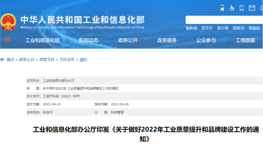 4月26日,工信部发布《关于做好2022年工业质量提升和品牌建设工作的通知》(以下简称《通知》),部署了推动企业质量管理体系升级、实施制造业质量管理数字化行动、深化企业先进质量管理工具与方法运用、提高制造业产品可靠性水平、提升制造业关键过程质量控制能力、提高质量公共服务效能、推动重点行业质量提升、加快推进工业品牌培育、持续提升“中国制造”品牌形象等九个方面的重点任务。