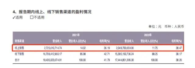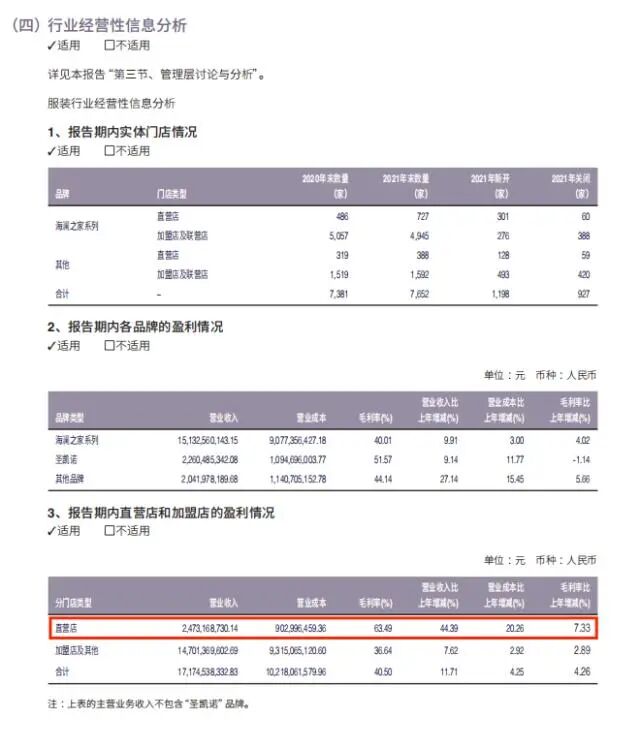 童装安全话题一直以来的都是家长关注的重点,海澜之家在印染童装的时候,创造性的研发了安全的水果染技术,从天然水果中萃取果汁染布料。染色过程中全程没有污水,生产过程中不添加任何化学助剂,以儿童身心健康为基础,用心呵护孩子健康成长。凸显海澜之家产品硬实力,提升动销率和品牌美誉度。疫情的持续反复以及随之而来的防控政策升级,在2021年对零售业的冲级和影响超预期,零售行业整体复苏、提价与估值修复仍需时间。2021年8月,商务部、财政部等六部门对外发布《关于支持线下零售、住宿餐饮、外资外贸等市场主体纾困发展有关工作的通知》,旨在加大对线下零售、住宿餐饮、外资外贸等受疫情持续影响的市场主体的定向支持,帮助相关行业企业有效应对当前疫情形势,更好服务构建新发展格局,推动行业复苏与高质量发展。值得注意的是,线下销售是海澜之家发展的基石,线下门店复苏是贯穿海澜之家全年销售的核心主题。因此,海澜之家的线下渠道正在通过优化门店结构、融入数字生态等手段,迎接市场的挑战。在2021年,海澜之家聚焦门店结构优化,在保持门店总数基本盘面不变的情况下,通过缩减低效门店,入驻核心商圈,大力拓展购物商场店,聚焦店效提升。2021年,海澜之家直营门店的毛利率已达63.49%,创历史新高。同时,新的门店选址、新的门店形象、以及海澜之家长期以来幼稚的服务,帮助海澜之家扩大线下渠道在年轻圈层的销量。财报显示,海澜之家线下门店共有5672家,其中直营门店净增241家。