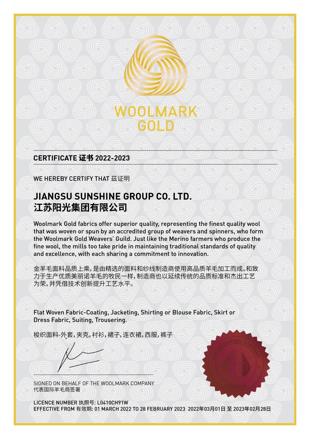 江苏阳光集团35年专注澳大利亚美丽诺羊毛的精加工,从澳大利亚遴选原料,洗毛制条、纺纱织造到后整理缔造多元功能面料,聘请专业的设计师团队剪裁精致霓裳。就如江苏阳光集团总裁陆晓明所说:“此次获得‘金羊毛’标志,这是对我们品牌、品质和工艺的认可和支持。同时,这也是对我们的激励和鞭策,我们将继续发挥技术和资源优势,为广大消费者带来最极致的产品和服务。”立足传统产业,制备高支轻薄型精纺面料及高端职业装;与时俱进,主攻绿色智能发展。阳光呢绒面料高达300支纱的“超细羊毛”是研究高端技术自主创新的高附加值产品。它轻薄如纱,呢面细洁,光泽自然,是十多家国际一线品牌的面料选择,也令企业成为国际顶级品牌生产链中的重要一环。