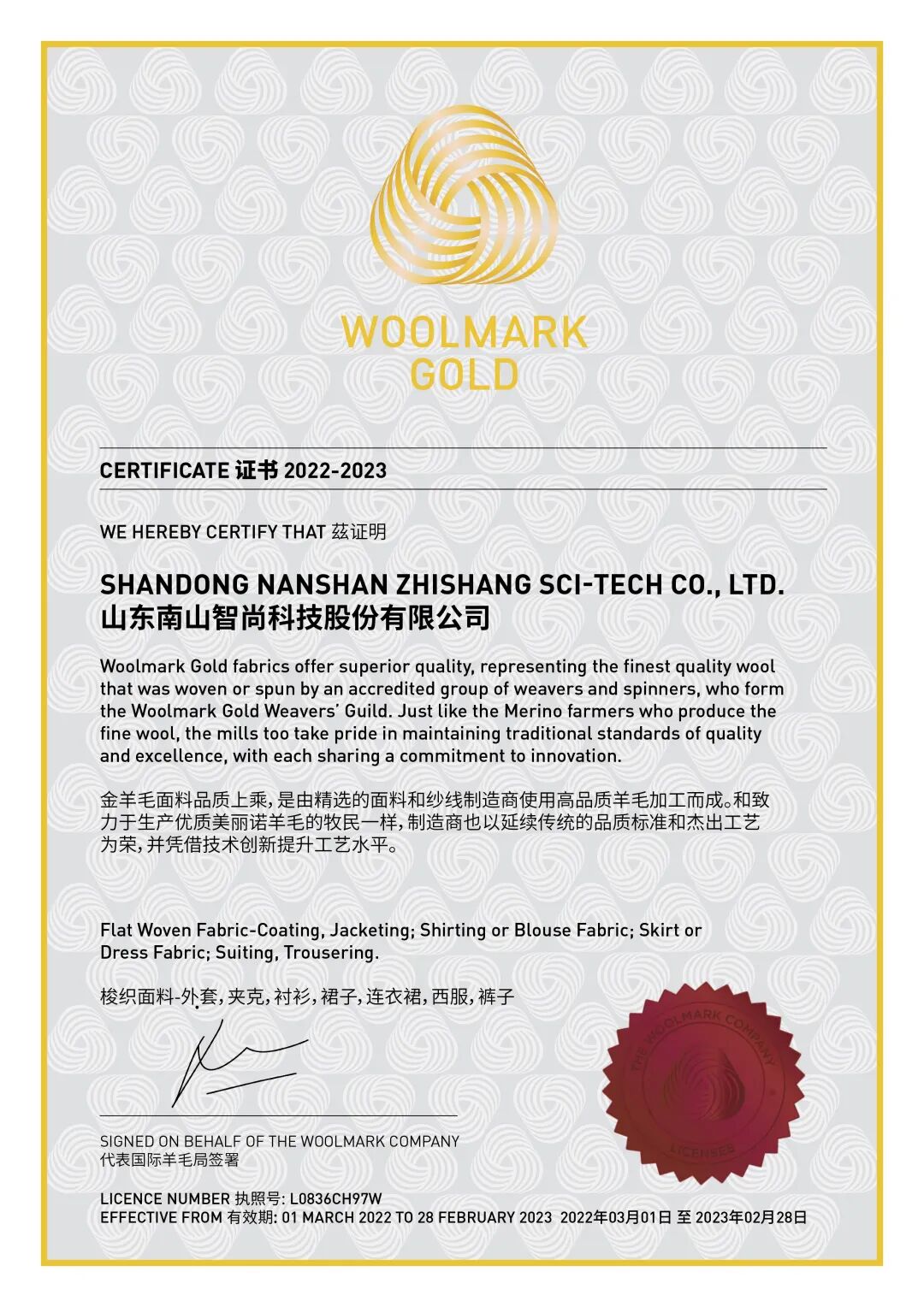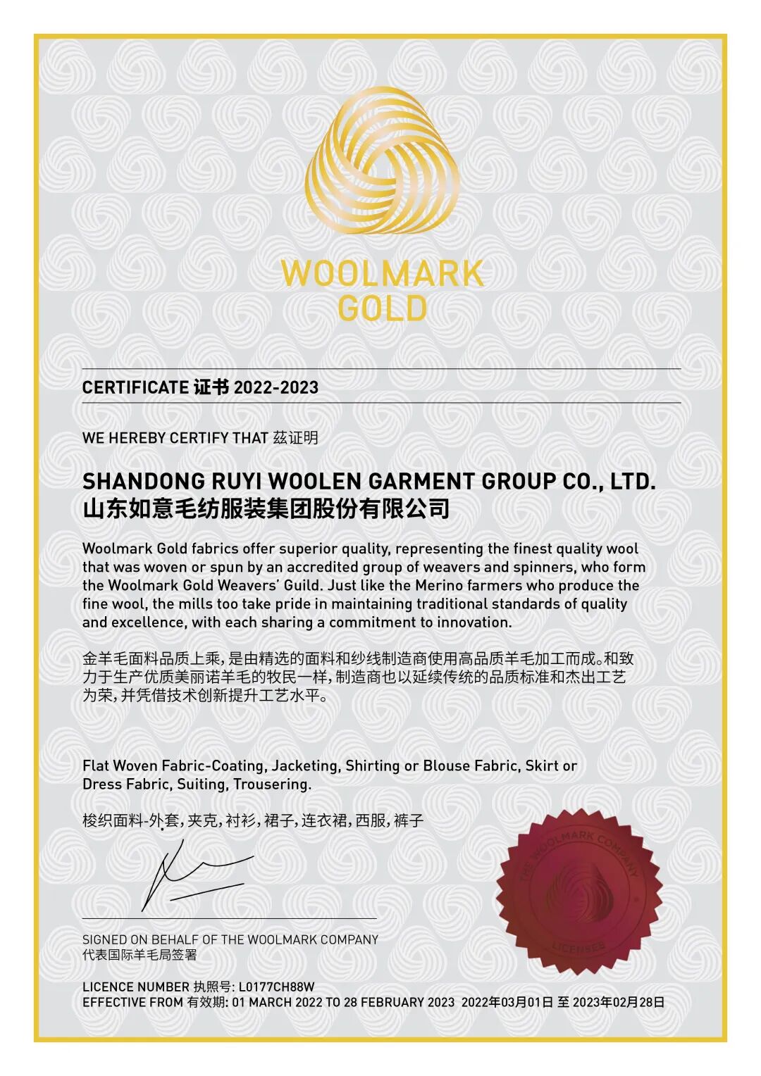 近日,中国服装协会副会长单位“山东如意”旗下如意毛纺服装集团股份有限公司、常务理事单位山东南山智尚科技股份有限公司、会员单位江苏阳光集团有限公司获得由国际羊毛权威机构The Woolmark Company授予的金羊毛标志(Woolmark Gold)认证。