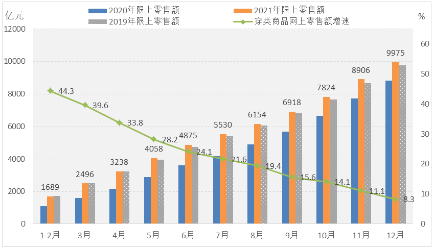随着疫情防控更加精准有效,在宏观经济稳步恢复、促消费政策持续发力以及网络购物节等因素的带动下,消费潜力持续释放,我国服装市场销售明显改善,线上消费对内需市场拉动作用持续凸显。根据国家统计局数据,2021年,我国限额以上单位服装类商品零售额累计9974.6亿元,同比增长14.2%,两年平均增长2.4%,仍低于2019年增速0.2个百分点,见图2。