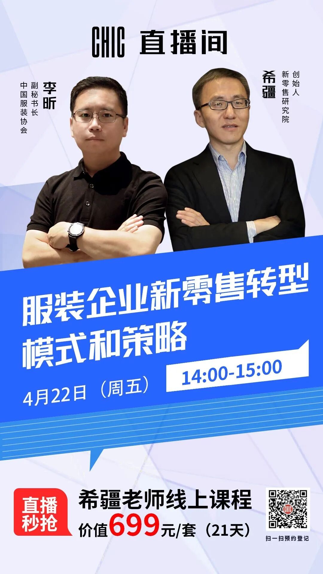 本期CHIC带您与新零售研究院创始人希疆老师一同围绕当下的服装消费特征、未来的消费趋势、服装的C2M模式、个性化定制发展前景、线上线下融合发展等热门话题深入探讨服装企业新零售转型的主要的模式和策略。直播间将抽取幸运观众免费送出价值699元线上21天新零售课程!