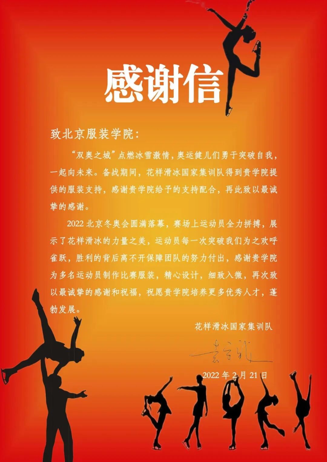 北京服装学院收到了来自国家体育总局冬季运动管理中心和花样滑冰国家集训队的感谢信。