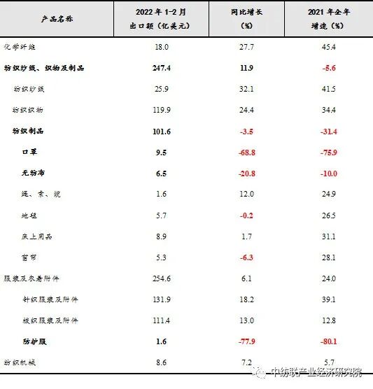 2022年1-2月,尽管面对海运费飙升、原材料价格上涨等不利因素,但美欧、东南亚等国家和地区对我国纺织服装产品需求仍在增加,我国纺织品服装出口继续保持增长态势,出口额达502.0亿美元,同比增长8.9%,创历年同期最高纪录。