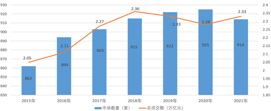 图表1 2015-2021年纺织服装专业市场数量与成交额