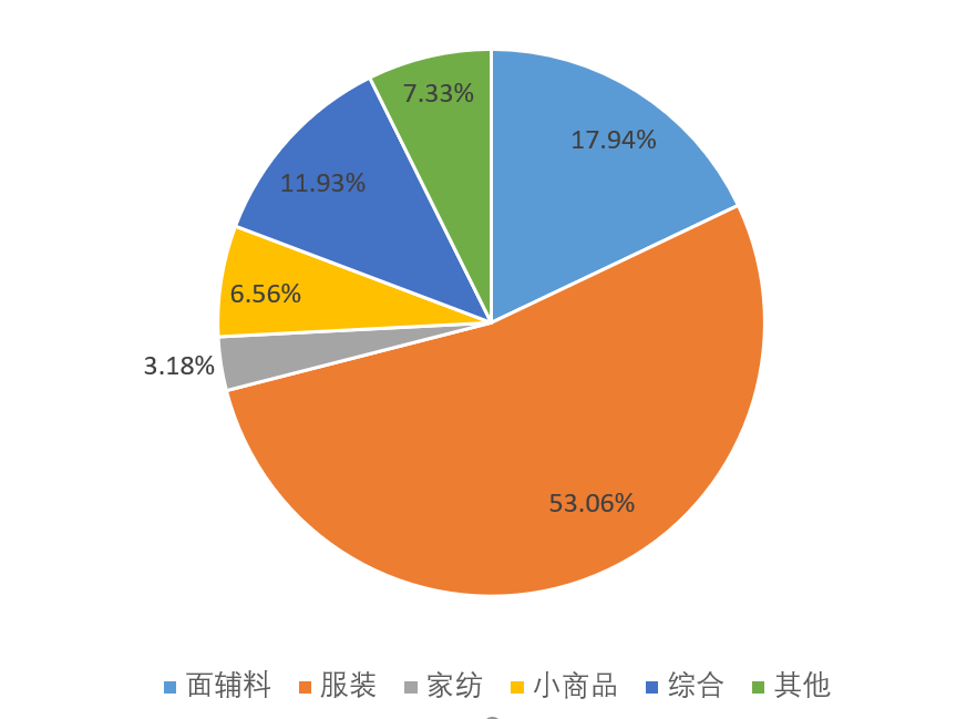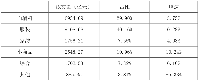 从品类看,服装和原、面(辅)料是我国纺织服装专业市场的主营商品,主营服装和原、面(辅)料的专业市场共649家,占市场总量的71.01%,成交额占总成交额的70.36%。其中,主营服装产品的专业市场485家,在各品类中成交额最高,达9408.68亿元,占总成交额的40.46%,同比上升0.28%;主营原、面(辅)料的专业市场164家,成交额位列第二,达6954.09亿元,占比29.90%,同比上升3.75%;主营家纺、小商品、综合类的专业市场也实现了成交额的正增长,其中,主营小商品的专业市场成交额增速最高,同比上升10.24%;家纺类专业市场运行稳中有进,同比上升4.08%;综合类专业市场同比上升6.10%;其他类专业市场同比下降5.33%。
