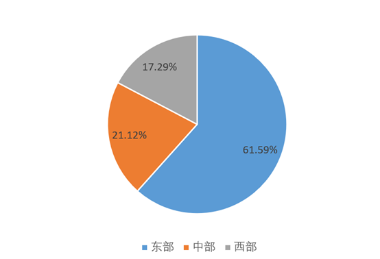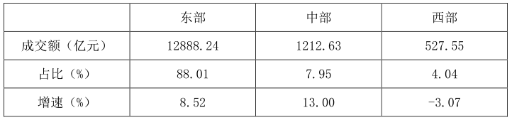 2021年1-12月,流通分会重点监测的46家纺织服装专业市场(含市场群)总成交额达到14628.41亿元,同比上升8.41%。其中,33家市场成交额同比上升,平均增幅为9.55%;12家市场成交额同比下降,平均降幅为-12.52%;1家市场成交额与2020年持平。从市场运行效率看,46家重点监测市场平均运行效率为65703.46元/平米,同比上升7.56%;平均商铺效率为502.11万元/铺,同比上升7.91%。从区域结构看,1-12月,46家重点监测市场中,东部地区专业市场成交额为12888.24亿元,同比上升8.52%,占专业市场总成交额的88.01%;中部地区专业市场成交额为1212.63亿元,同比上升13.00%,占专业市场总成交额的7.95%;西部地区专业市场成交额为527.55亿元,同比下降3.07%,占专业场总成交额的4.04%。图表8 46家重点监测市场东中西部地区成交额占比、增速表