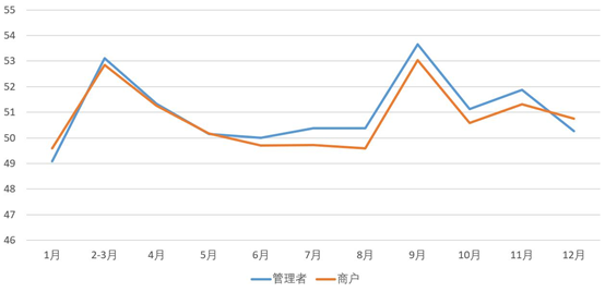 景气方面。2021年,纺织服装专业市场管理者景气与商户景气走势基本一致。随着春节假期结束和春装上市,2-3月纺织服装专业市场迎来上半年销售旺季;4-8月,景气指数小幅波动,整体运行平稳;9-10月,纺织服装专业市场迎来全年的销售黄金期,线上线下融合发展、内贸外贸融合发展、批发零售融合发展,实现了销售额的逆势增长,景气指数稳健回升;第四季度,受暖冬影响,冬装销售情况不佳,景气指数下滑。从全年看,2021年专业市场管理者景气指数全年平均值为51.04,商户景气指数全年平均值为50.78,两项平均数均高于50荣枯线,相较2020年有所回升,管理者景气略高于商户景气。