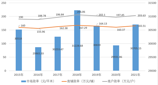 新市场方面。2021年,新开业万平米以上纺织服装类专业市场9家,新开业专业市场总投资额为30.9亿元,总经营面积为32.6万平米。运行效率方面。2021年纺织服装专业市场商铺效率为165.51万元/铺,同比上升3.21%;商户效率为203.63万元/户,同比上升3.13%;市场效率为30705.15元/平米,同比上升2.58%。图表2 2015-2021年纺织服装专业市场运行效率