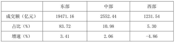从区域看,914家专业市场中,东部地区563家,成交额19471.16亿元,占总成交额的83.72%,同比上升3.41%。东部地区是我国纺织服装专业市场行业的龙头地区和中流砥柱,东部地区的逆势增长是全国纺织服装专业市场总成交额实现回升的主要原因;中部地区193家市场成交额2552.44亿元,占总成交额的10.98%,同比上升2.06%,2020年,中部地区受疫情影响严重,成交额出现20%以上的下滑,2021年,中部地区专业市场成交额稳健回升,但尚未恢复至疫情前水平;西部地区158家市场成交额1231.54亿元,占总成交额的5.30%,同比下降4.86%,与2020年相比,降幅有所收窄。