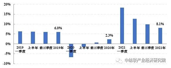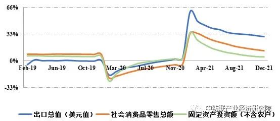 2021年,虽然遭遇国内疫情散发及国际市场供需形势复杂等多重压力,我国宏观经济仍实现持续恢复发展,经济增速居全球前列。统计数据显示,2021年我国国内生产总值(GDP)达114.4万亿元,同比增长8.1%,以2019年为基期计算(下同),两年平均增长5.1%;全国社会消费品零售总额、出口总额(美元值)和固定资产投资完成额(不含农户)同比分别增长12.5%、29.9%和4.9%,两年平均分别增长3.9%、16%和3.9%。其中,社会消费品零售总额两年平均增速虽然尚未恢复至疫情前水平,但最终消费支出对GDP的增长贡献率达到65.4%,居“三驾马车”之首,表明国内大循环的主体作用逐步增强。在国际供应链运转不畅的情况下,我国制造业的体系化优势充分显现,货物贸易出口总额实现快速增长,净出口对GDP增长的贡献率达到20.9%,明显高于疫情前水平。全年,规模以上企业工业增加值和利润总额同比分别增长9.6%和34.3%,两年平均分别增长5.8%和18.2%,表明工业企业生产经营情况均处于平稳改善状态。图2:我国GDP同比增速