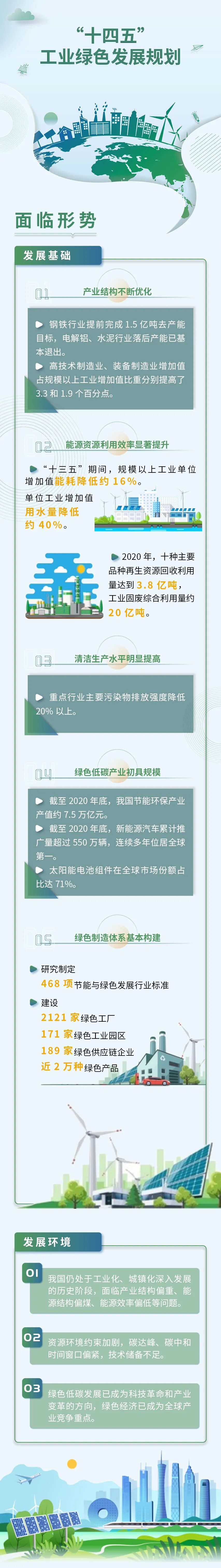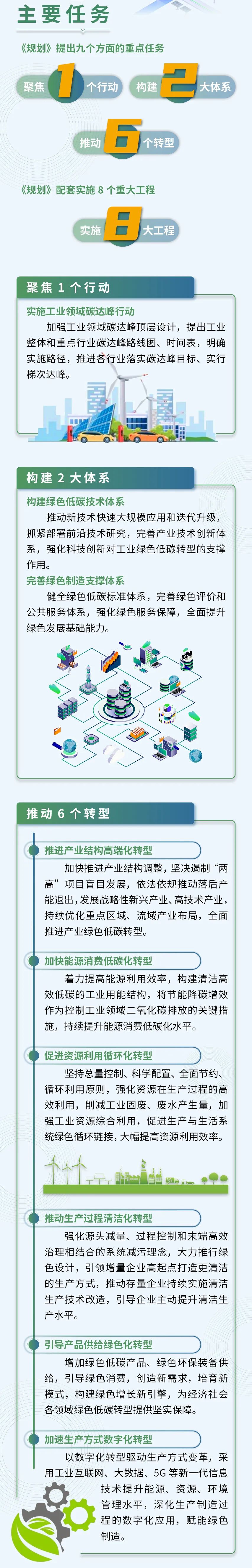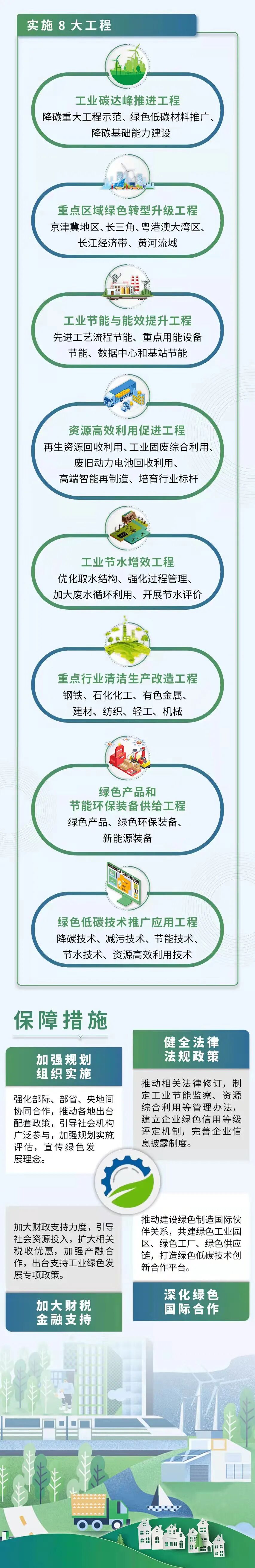 工业和信息化部近日印发了《“十四五”工业绿色发展规划》(工信部规〔2021〕178号,以下简称《规划》)。《规划》指出,“十四五”时期,是我国应对气候变化、实现碳达峰目标的关键期和窗口期,也是工业实现绿色低碳转型的关键五年。面对新形势、新任务、新要求,要提高政治站位,迎难而上,攻坚克难,坚定不移走生态优先、绿色低碳的高质量发展道路。《规划》强调,“十四五”工业绿色发展要以习近平新时代中国特色社会主义思想为指导,全面贯彻党的十九大和十九届二中、三中、四中、五中、六中全会精神,深入贯彻习近平生态文明思想,立足新发展阶段,完整、准确、全面贯彻新发展理念,构建新发展格局,落实制造强国、网络强国战略,以推动高质量发展为主题,以供给侧结构性改革为主线,以碳达峰碳中和目标为引领,以减污降碳协同增效为总抓手,统筹发展与绿色低碳转型,深入实施绿色制造,加快产业结构优化升级,大力推进工业节能降碳,全面提高资源利用效率,积极推行清洁生产改造,提升绿色低碳技术、绿色产品、服务供给能力,构建工业绿色低碳转型与工业赋能绿色发展相互促进、深度融合的现代化产业格局,支撑碳达峰碳中和目标任务如期实现。《规划》提出,到2025年,工业产业结构、生产方式绿色低碳转型取得显著成效,绿色低碳技术装备广泛应用,能源资源利用效率大幅提高,绿色制造水平全面提升,为2030年工业领域碳达峰奠定坚实基础。其中,碳排放强度持续下降,单位工业增加值二氧化碳排放降低18%。能源效率稳步提升,规模以上工业单位增加值能耗降低13.5%。资源利用水平明显提高,大宗工业固废综合利用率达到57%,主要再生资源回收利用量达到4.8亿吨,单位工业增加值用水量降低16%。污染物排放强度显著下降,重点行业主要污染物排放强度降低10%。绿色制造体系日趋完善,重点行业和重点区域绿色制造体系基本建成,绿色环保产业产值达到11万亿元。《规划》按照“目标导向、效率优先、创新驱动、市场主导、系统推进”的基本原则,紧扣工业和信息化部核心职能,提出“聚焦1个行动、构建2大体系、推动6个转型、实施8大工程”的整体工作安排。即以实施工业领域碳达峰行动为引领,着力构建完善的绿色低碳技术体系和绿色制造支撑体系,系统推进工业向产业结构高端化、能源消费低碳化、资源利用循环化、生产过程清洁化、产品供给绿色化、生产方式数字化等6个方向转型,配套实施工业碳达峰推进工程、重点区域绿色转型升级工程、工业节能与能效提升工程、资源高效利用促进工程、工业节水增效工程、重点行业清洁生产改造工程、绿色产品和节能环保装备供给工程、绿色低碳技术推广应用工程等8大工程。《规划》明确了加强规划组织实施、健全法律法规政策、加大财税金融支持、深化绿色国际合作等保障措施。要求各地结合实际制定出台配套政策,落实规划总体要求、目标和任务,抓好规划贯彻落实。
