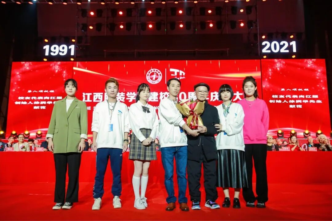 建校30周年,这是一个举校欢庆的日子,大会上江西服装学院校友、师生也纷纷上台,为母校30周年生日献词。校友代表还向江西服装学院创办人涂润华先生献上了鲜花。