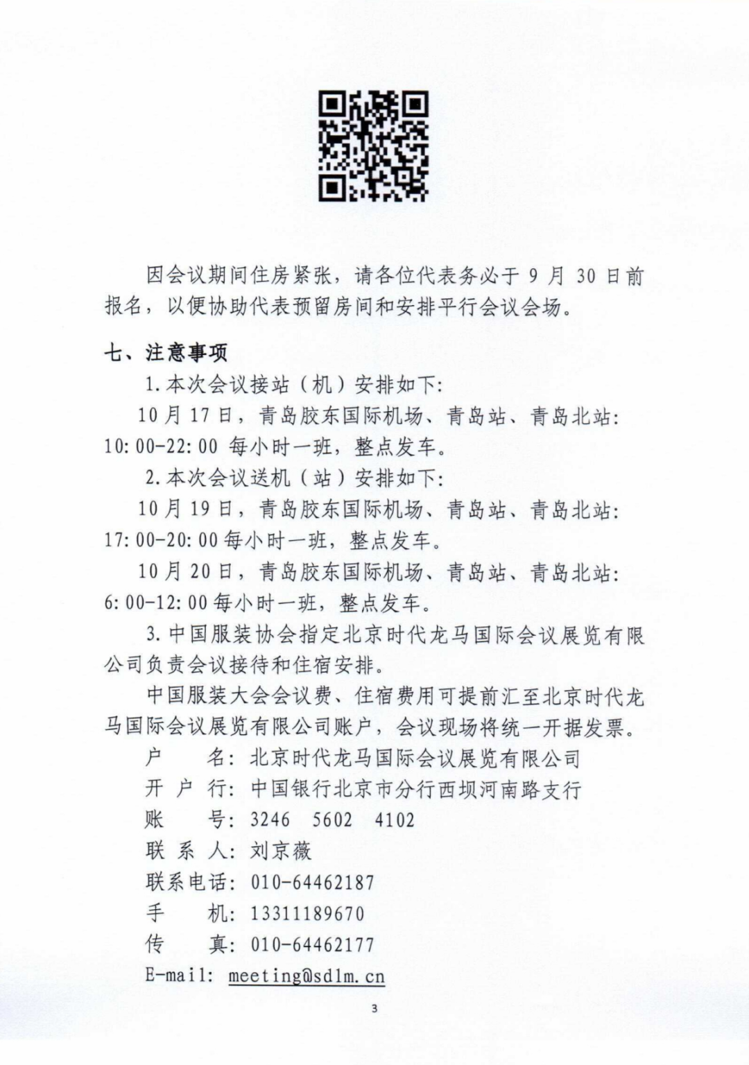因会议期间住房紧张,请各位代表务必于9月30日前报名,以便协助代表预留房间和安排平行会议会场。10月17日,青岛胶东国际机场、青岛站、青岛北站:10月19日,青岛胶东国际机场、青岛站、青岛北站:10月20日,青岛胶东国际机场、青岛站、青岛北站:3.中国服装协会指定北京时代龙马国际会议展览有限公司负责会议接待和住宿安排。中国服装大会会议费、住宿费用可提前汇至北京时代龙马国际会议展览有限公司账户,会议现场将统一开据发票。联系电话:010-85229689/85229437
