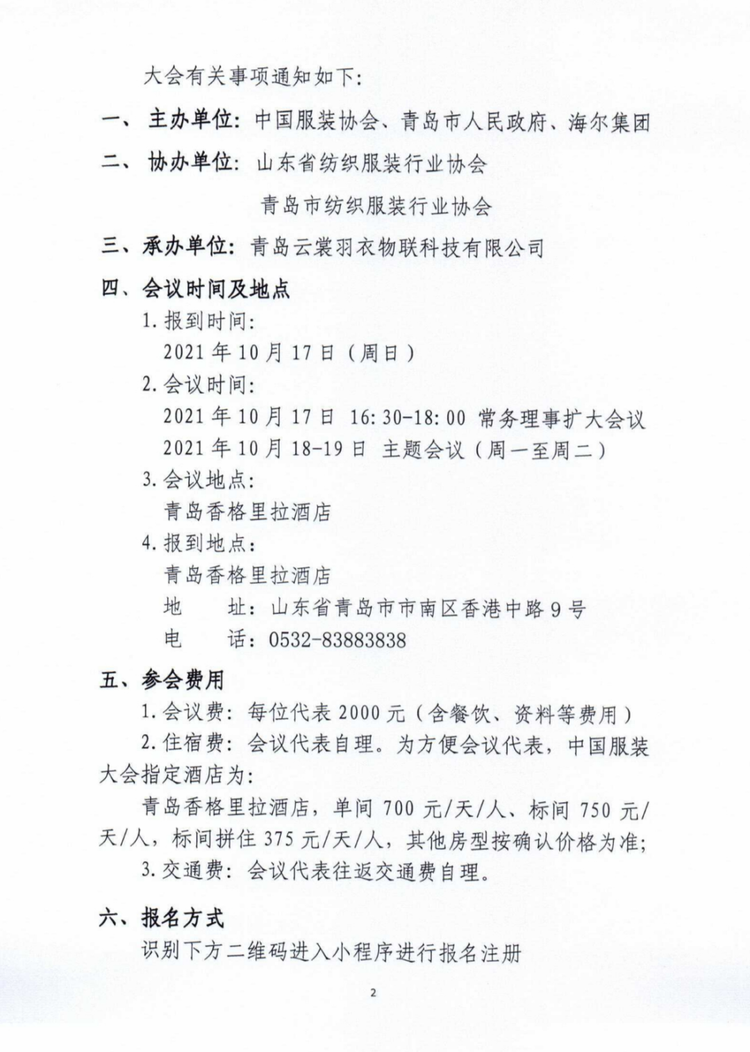 中国服装协会定于2021年10月18-19日在山东青岛香格里拉酒店召开“2021中国服装大会”。2021中国服装大会将以“开创新格局、强国再出发”为主题 ,汇聚科技、文化、经济、消费、绿色等领域的趋势洞察和创新实践,以宽广的视野、长远的眼光认识时代、理解未来,锚定创意高密集、资源高融合、产品高附加值的高质量发展目标,为“十四五”开好局、起好步。本届大会包括:2021年中国服装协会七届六次常务理事会扩大会议、2021中国服装大会主题大会暨中国服装协会七届四次理事会、中国服装大会平行会议、中国服装大会高端论坛、参观海尔集团、中国服装协会三十周年志庆等活动。请中国服装协会副会长、常务理事、理事及会员单位负责人,各地服装行业协(商)会、行业主管部门及服装名城名镇负责人,各专业委员会主任、副主任委员安排时间出席会议。2021年10月17日 16:30-18:00 常务理事扩大会议2021年10月18-19日 主题会议(周一至周二)1.会议费:每位代表2000元(含餐饮、资料等费用)2.住宿费:会议代表自理。为方便会议代表,中国服装大会指定酒店为:青岛香格里拉酒店,单间700元/天/人、标间750元/天/人,标间拼住375元/天/人,其他房型按确认价格为准;