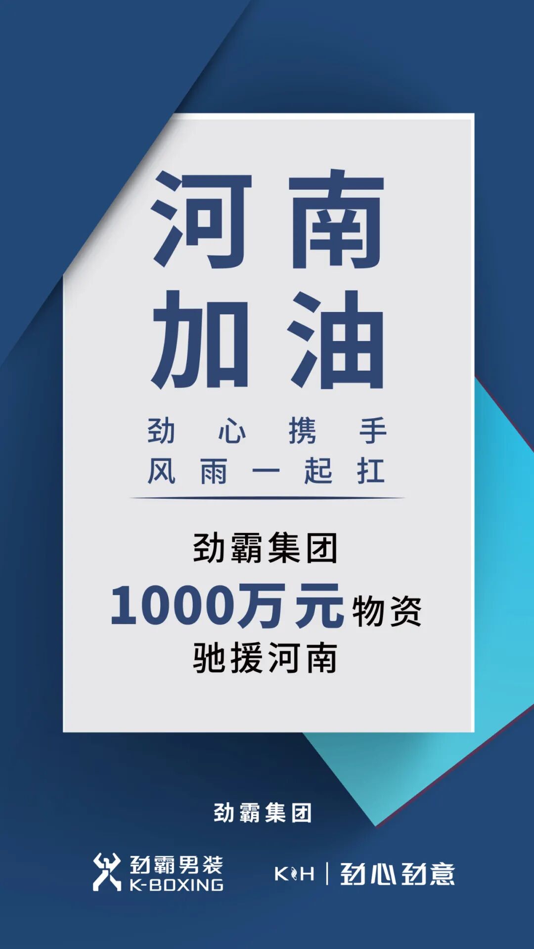 河南加油!劲霸集团将持续密切关注灾区需求及灾后防疫、灾后重建等需求,尽己所能,精准驰援。劲霸男装始终以“家国实业楷模”为愿景,履行中国品牌的社会责任,劲心携手风雨一起扛!精彩推荐: