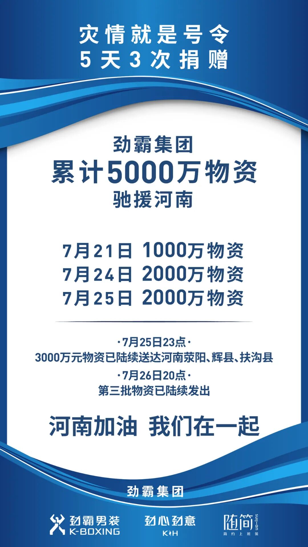 / 企业动态 | 劲霸集团5天3次捐赠,累计5000万物资驰援河南