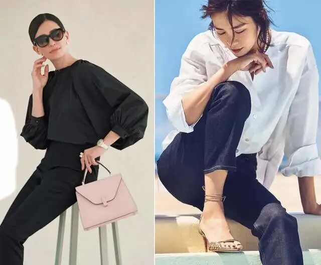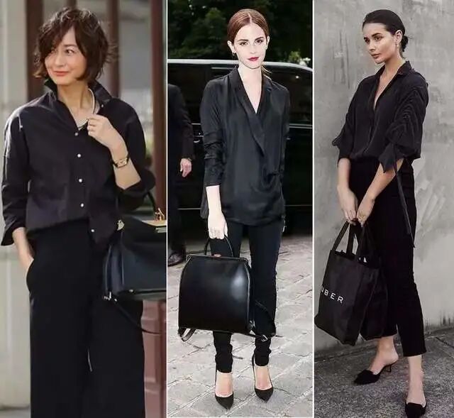 比起裙装,黑色裤装在高贵之余更多了几分酷感与帅气。夏天,我们可以选择一些材质轻柔透气的黑色雪纺衬衫或真丝衬衫搭配黑色九分裤,穿出极简的优雅与洒脱。记得将衬衫领口多松开几颗纽扣,又或者旋转V领的款式,露出脖颈处的肌肤,营造轻盈透气感,再将袖子挽起,露出手臂和脚踝,这样整体看上去,就算是一身黑色,也不会显得沉重和闷热。▼