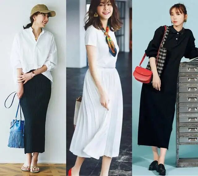 极简黑白配固然很经典,但是有时候难免会显得有点太过高冷和单调。夏天里,学会在黑白穿搭之中加入一点点的彩色来点缀,往往能够起到画龙点睛的作用。基础款白衬衫搭配黑色包臀裙,用一个蔚蓝色的流苏包包来点缀,整体装扮立马显得没那么无聊。白色T恤搭配百褶裙,加一条五彩斑斓的小丝巾,再搭配一对红色高跟鞋,原本简单的全白穿搭也瞬间变得优雅高级起来,而黑色连衣裙搭配一个红色小挎包,也让整套造型更时尚更有亮点。▼