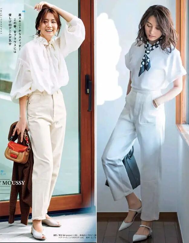 喜欢穿裤装的朋友,也可以采用一身白色穿搭,演绎极致简约的优雅与高级。白色的泡泡袖法式衬衫搭配白色休闲牛仔裤,兼顾了华美与休闲,风格平衡,又美又帅。白色T恤在夏天最实用,搭配白色烟管裤和淑女风的尖头鞋,也属于简约的轻熟风,再加一条复古波点小丝巾增加优雅女人味,即可打破平庸,将普通的基础款白T恤穿出与众不同的高级感。▼