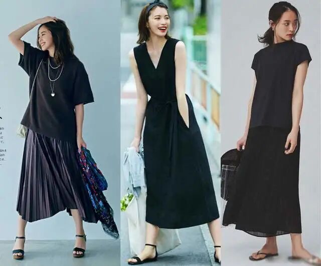 一年四季,寒暑交替,all-black全黑穿搭一直是时髦精们的最爱,夏天也不例外。皆因穿一身黑色,可以在极致的简约之中,呈现出女人的高贵、神秘、矜持与性感。黑色的基本款圆领T恤,没有任何图案装饰,简单至极,搭配黑色百褶裙或雪纺半裙,极简的高级与魅力得以完美呈现。如果喜欢黑色连衣裙,那就选V领、无袖的款式,尽量多露一些肌肤,可以减弱黑色的沉闷感,让你看上去更显轻盈。▼