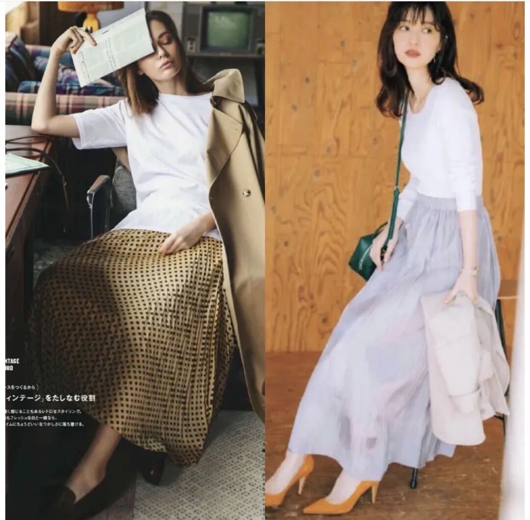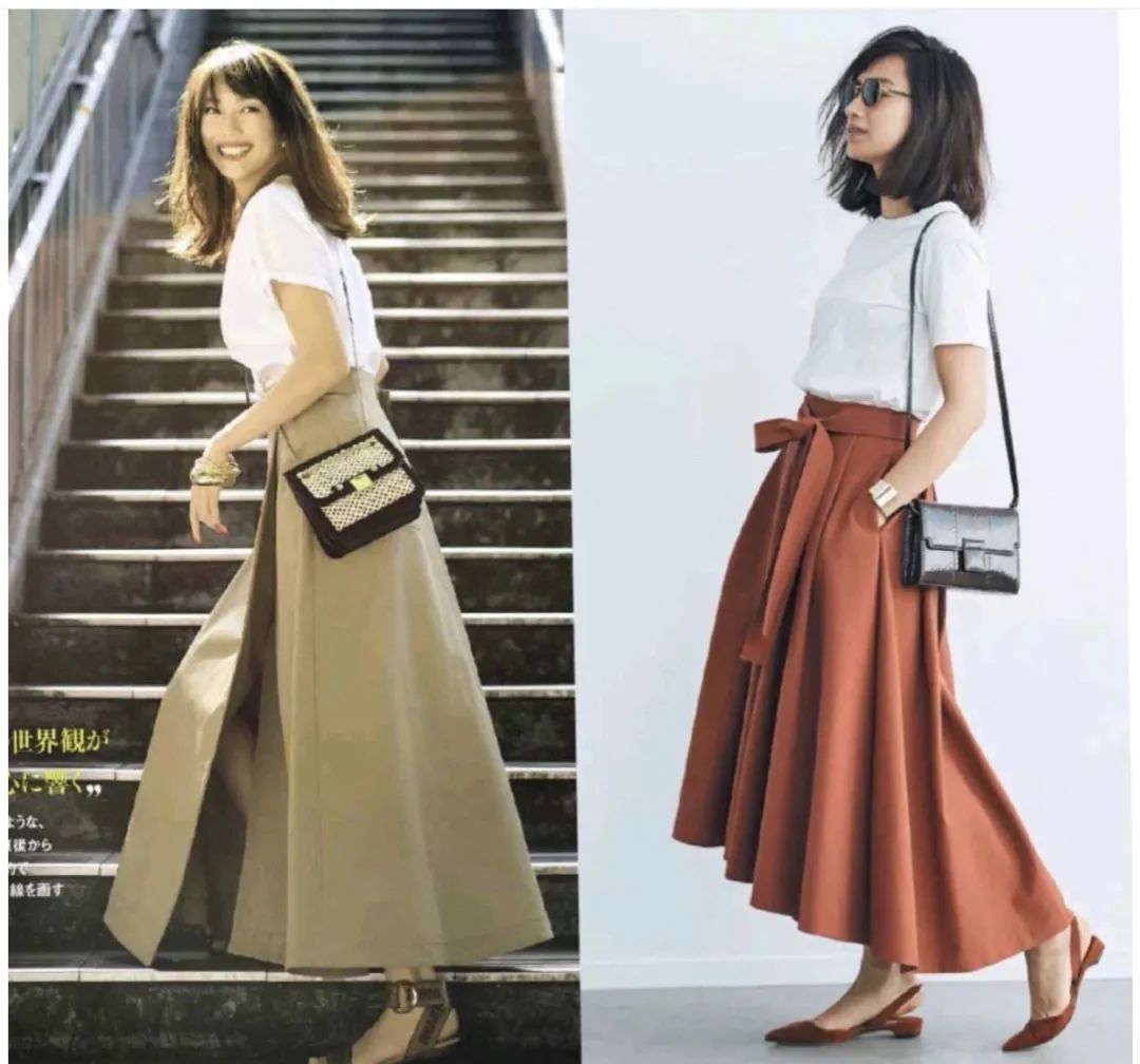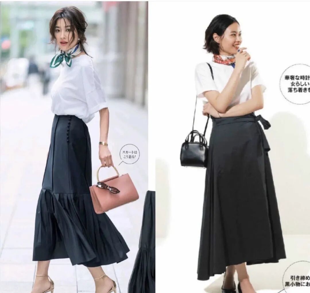 无论什么季节,很多人为了简单方便都喜欢不易出错的“黑白配”,这是一个万能的搭配公式!可能放在日常裤装穿搭上会有古板严肃的感觉,即使是白色T恤搭配黑色短裙都会有职业的严肃感。但是换成过膝的黑色长裙,却是满满的温柔感,加上一条彩色的小丝巾搭配,更是优雅大方!白色T恤+彩色半身裙