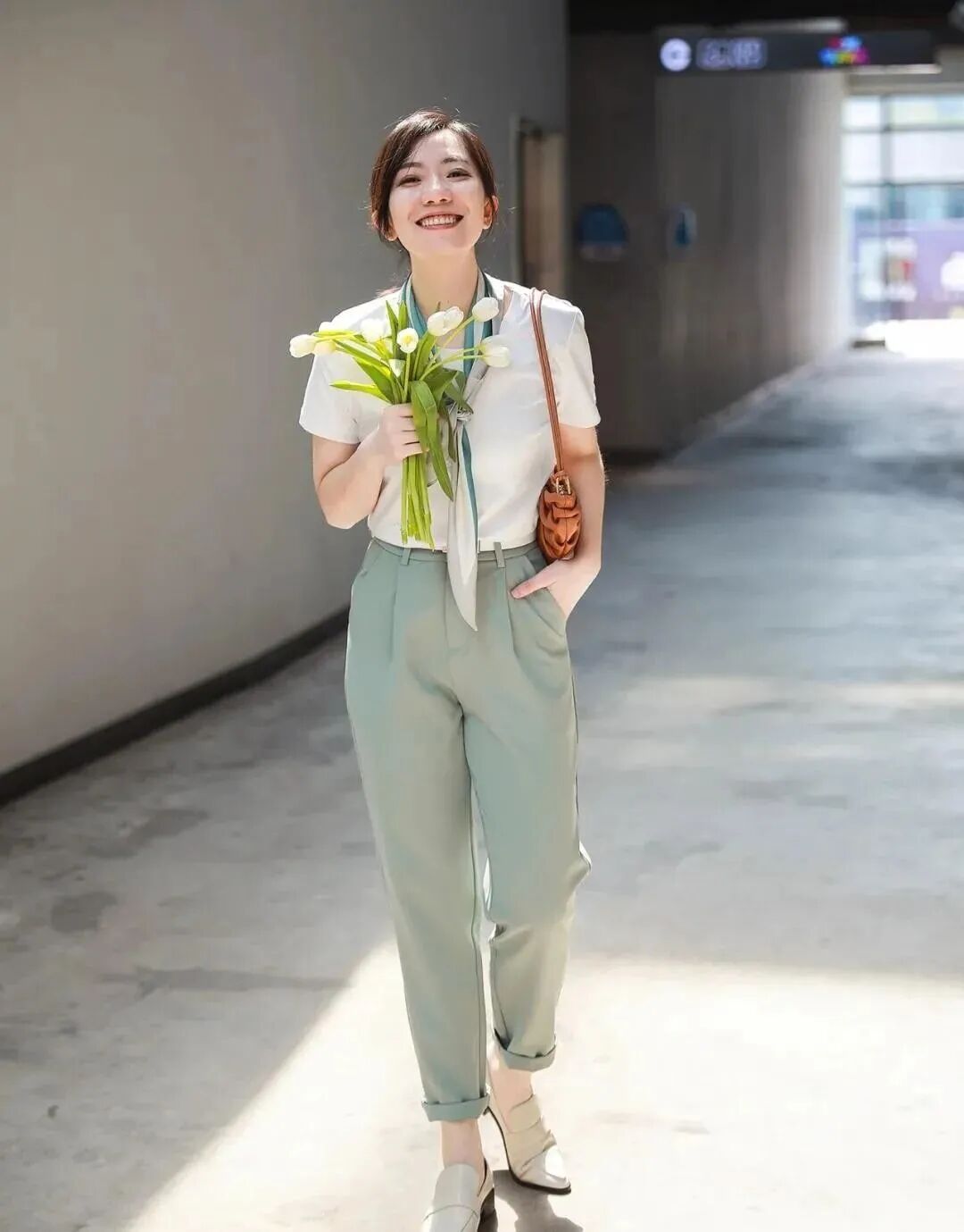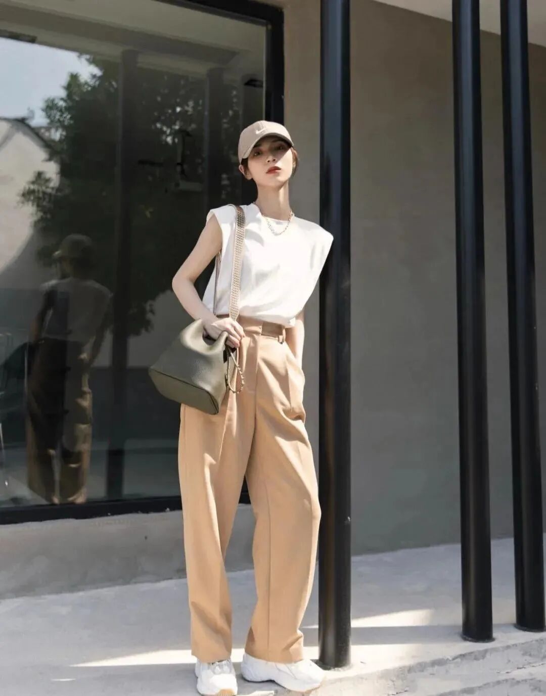 混搭又舒适的穿搭莫过于T恤搭西装直筒裤,简约基础款的碰撞也有不一样的火花。比如,白色T恤搭个灰色西装直筒裤,既不失大方,又能更好地展现气质,对各种身材的女生都很友好,把T恤塞到裤腰里有利于营造腰线,最后搭一双帆布鞋,妥妥的精简时髦精。