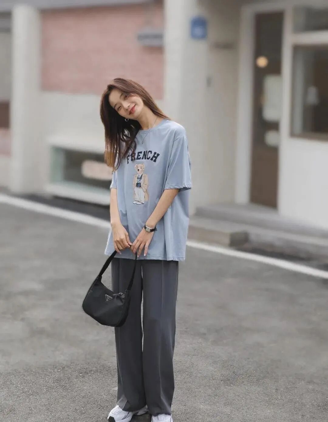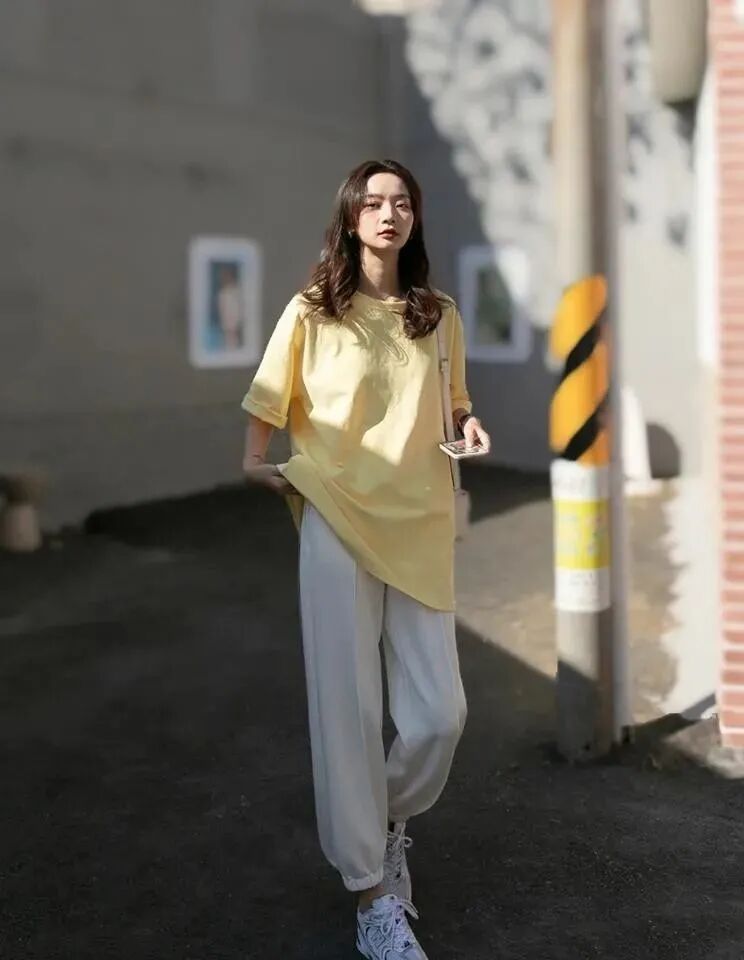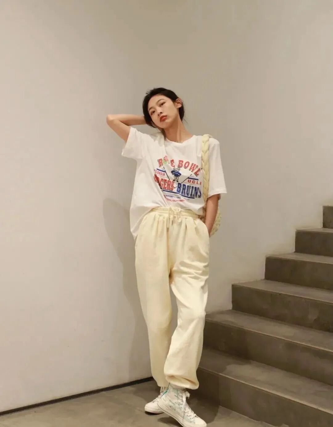 夏天也少不了运动风的穿搭,基础款的T恤搭个运动类型的直筒裤也是元气少女的心头爱。比如,白色印花T恤搭个灰色运动直筒裤,随意酷帅,舒适又好看,最后搭双老爹鞋,增添不少青春活力感!