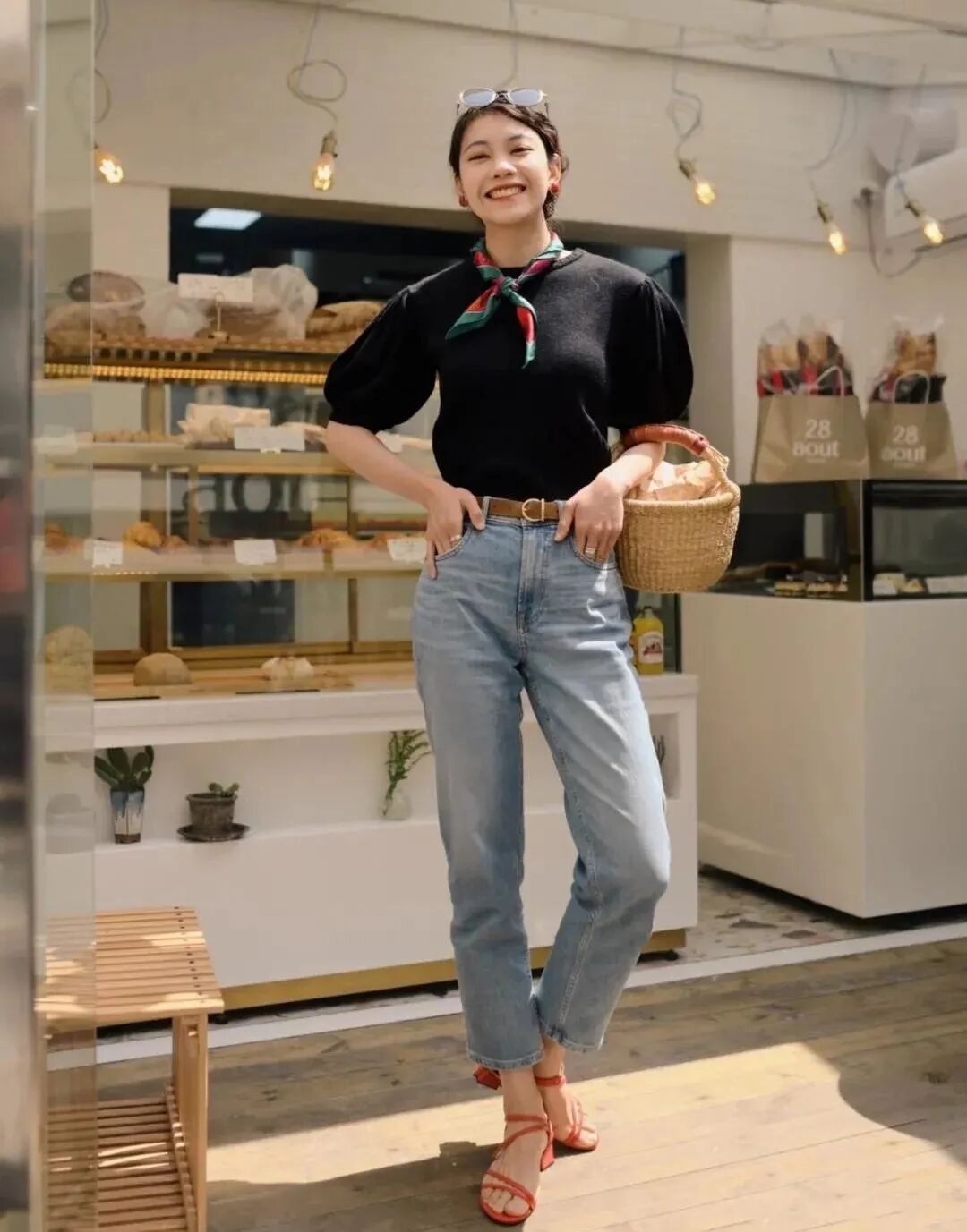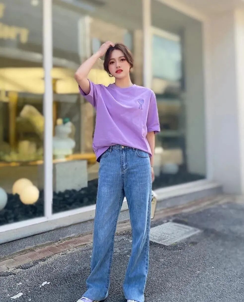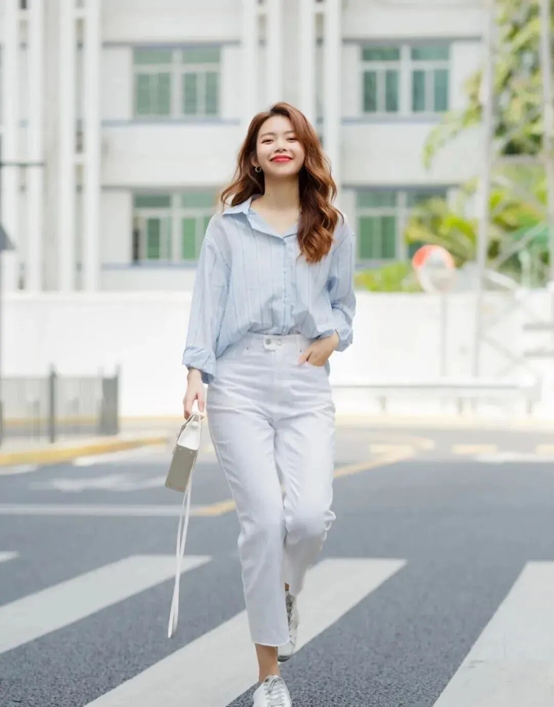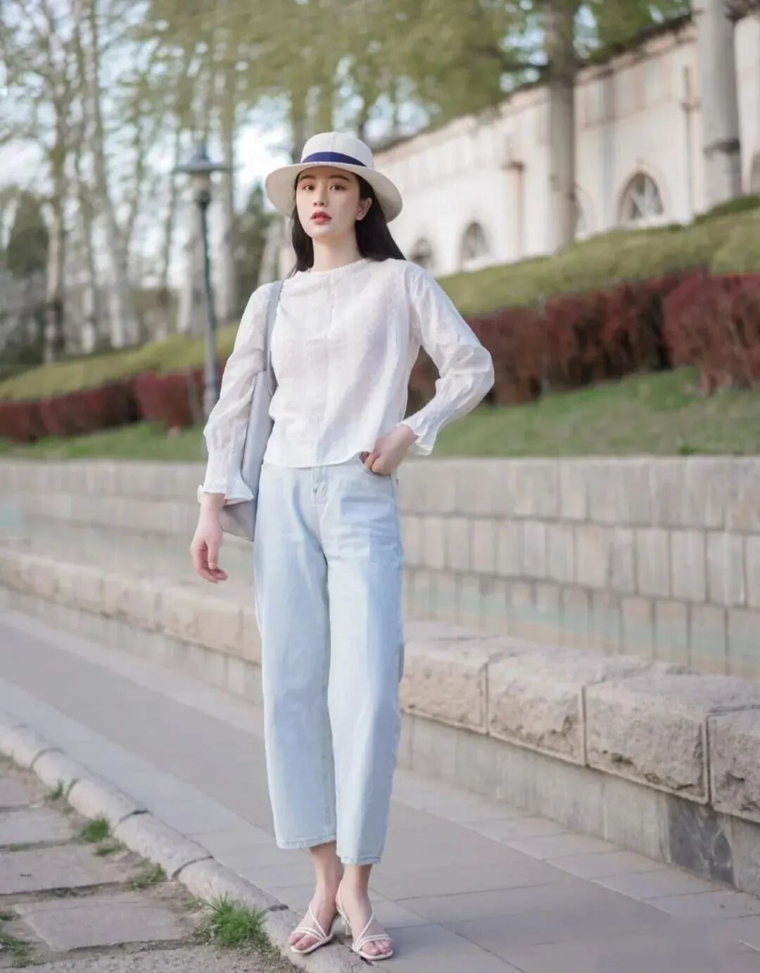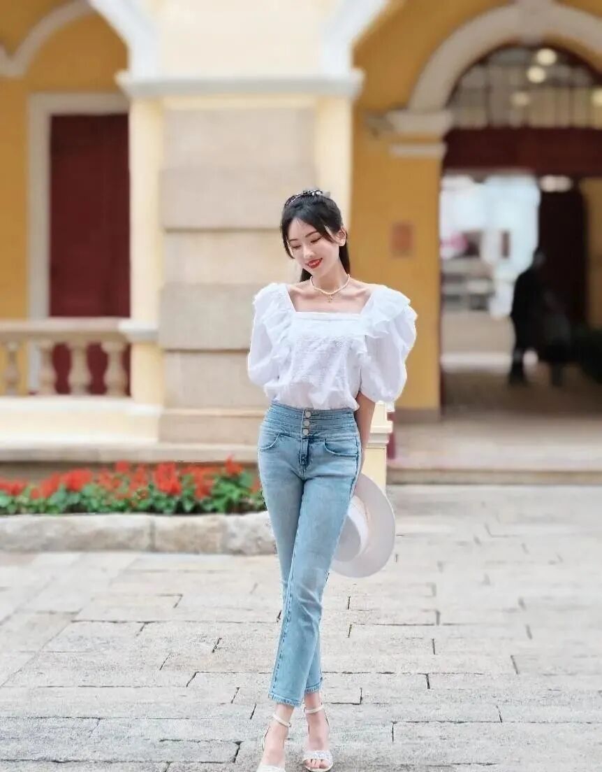 选择牛仔九分裤时,胯大屁股宽的女生尽量选大一码,过于贴紧会勒大腿,没有美感。比如说,嫩黄色泡泡袖短袖搭个白色牛仔九分裤,超级减龄,如果想要更女神一点,搭个高跟凉鞋,气场瞬间爆满!
