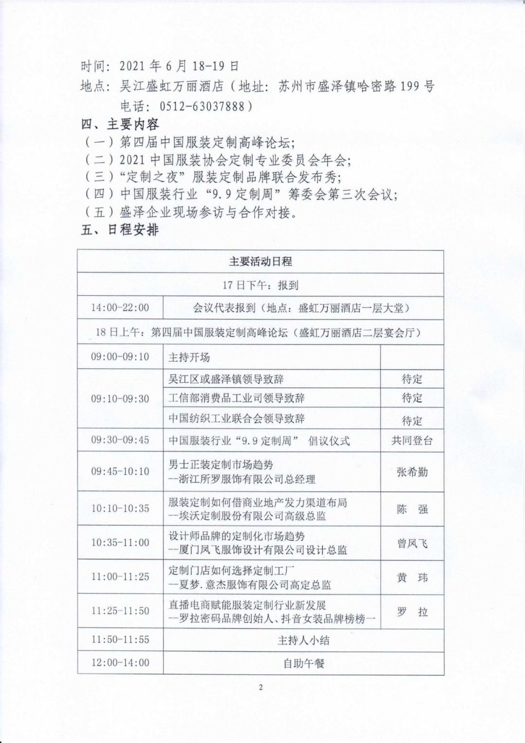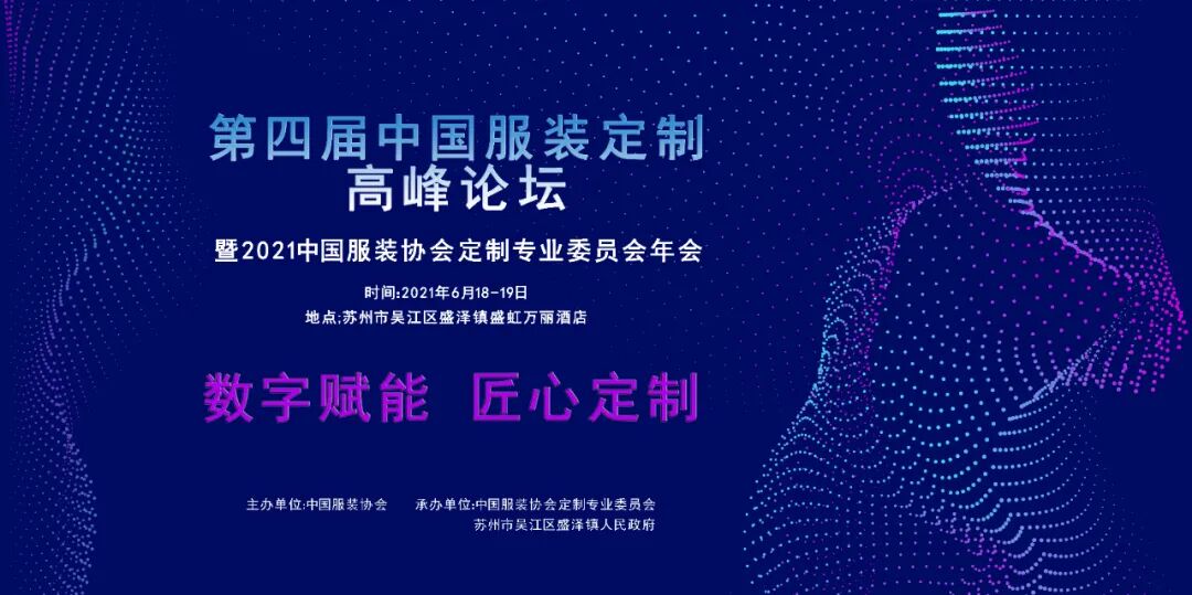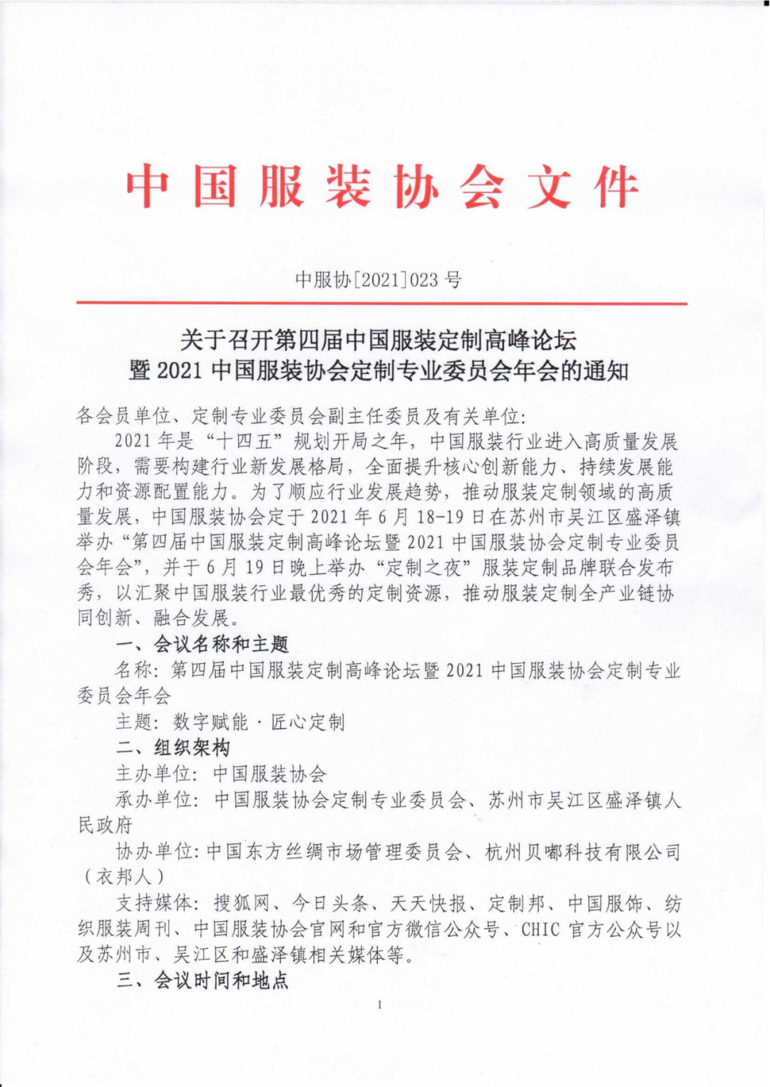 名称:第四届中国服装定制高峰论坛暨2021中国服装协会定制专业委员会年会承办单位:中国服装协会定制专业委员会、苏州市吴江区盛泽镇人民政府协办单位:中国东方丝绸市场管理委员会、杭州贝嘟科技有限公司(衣邦人)支持媒体:搜狐网、今日头条、天天快报、定制邦、中国服饰、纺织服装周刊、中国服装协会官网和官方微信公众号、CHIC官方公众号以及苏州市、吴江区和盛泽镇相关媒体等。三、会议时间和地点