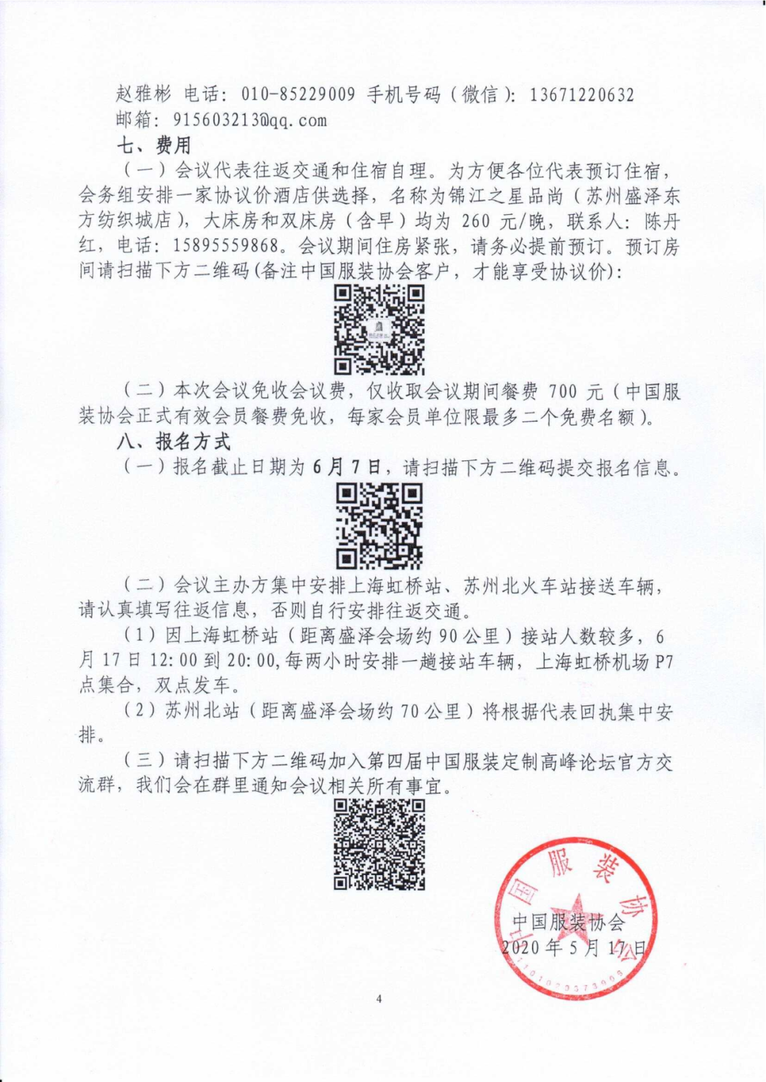 (二)会议主办方集中安排上海虹桥站、苏州北火车站接送车辆,请认真填写往返信息,否则自行安排往返交通。(1)因上海虹桥站(距离盛泽会场约90公里)接站人数较多,6月17日12:00到20:00,每两小时安排一趟接站车辆,上海虹桥机场P7点集合,双点发车。(2)苏州北站(距离盛泽会场约70公里)将根据代表回执集中安排。(三)请扫描下方二维码加入第四届中国服装定制高峰论坛官方交流群,我们会在群里通知会议相关所有事宜。