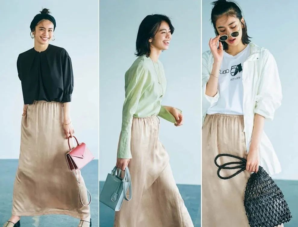 夏天的衣橱,裙子当然不能缺席。选择一条淡漠色系的缎面半身长裙,它的百搭和美丽会带给你不同的惊喜。柔软似水的缎面质感,随着步伐流动,女人味十足,休闲束腰版型,带来轻松的休闲意味,有点随意,又有点妩媚,搭配黑色的设计感圆领罩衫,又或者苹果绿的衬衣都很好看。换成白T恤跟白衬衫叠穿,又是可盐可甜的夏日极简出街look。▼