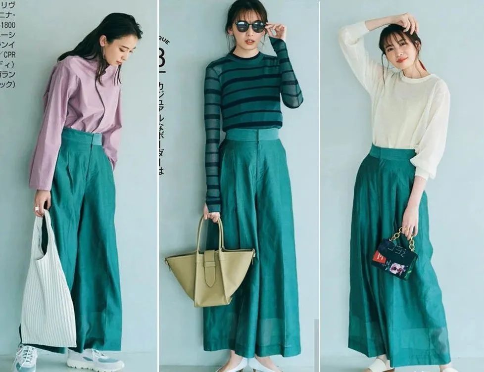 夏天不知道穿什么裤子?试试绿色阔腿裤吧!小众又很有气质的颜色,醒目的同时又不会太过张扬,宽松的高腰款式,舒适又很有女人味。色彩的变化总是能起到神奇的视觉效果,改变穿搭的配色,往往就能改变一件衣服。一身同色系、撞色、搭配亮色,不同的组合会给人不同的感觉。绿色阔腿裤搭配香芋紫或者白色衬衫,可盐可甜,美得令人心旷神怡。搭配绿色紧身条纹薄T,同色系搭配简约又高级。同一条裤子,不同的配色,每天带来焕然一新的造型。▼