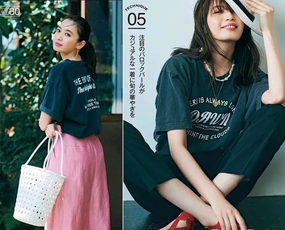 黑色T恤的经典,可以跟白T恤并驾齐驱。而且比起白T,黑色T恤多了一些酷酷的帅气感觉,夏天有不少女生也很喜欢穿黑色T恤。带有白色字母图案的黑T恤是夏季衣橱必备,搭配简单的白色半身裙,可以减弱黑T恤的闷热感,让整体穿搭变轻盈。和芥末黄色的吊带裙叠穿,又美又酷,极简的时髦也可以很有个性。▼