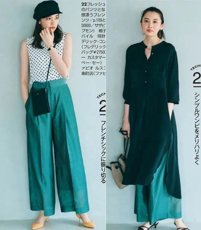 还是同一条裤子,可以搭配黑白波点无袖衫,用一对黄色尖头高跟鞋来点缀更是神来之笔,整个造型带点复古的感觉,简约优雅又不失俏皮与活泼。换成黑色雪纺衬衫裙搭配绿色阔腿裤,又变成端庄大气的极简风穿搭,上班也可以这样穿。▼