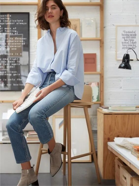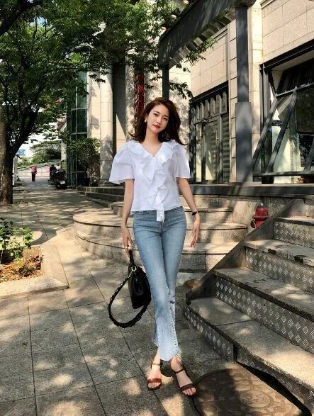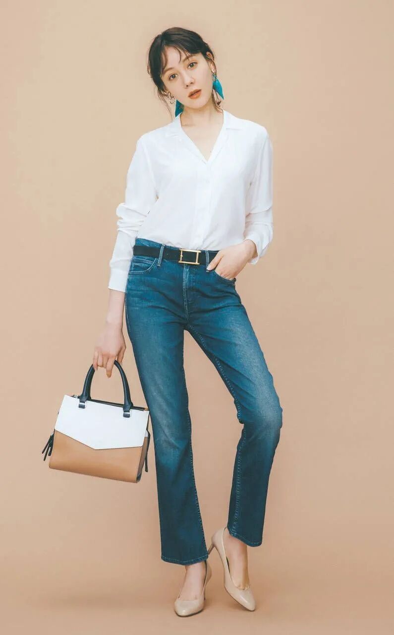 最基础的当属纯白色衬衫,配合西装正式庄重,而单穿又能轻松休闲,属实百搭!倒是牛仔裤的版型对时尚效果的影响更大,需要根据不同的场合进行选择。常规的白衬衫搭配铅笔裤构成高级而不失清新的蓝白配色,纯洁大方。高腰外穿的方式来提升腰线,搭配露脚面的高跟鞋延长腿部比例的同时更添轻盈感,干练而不失时尚,简单却非常耐看,相当适合职场女性。