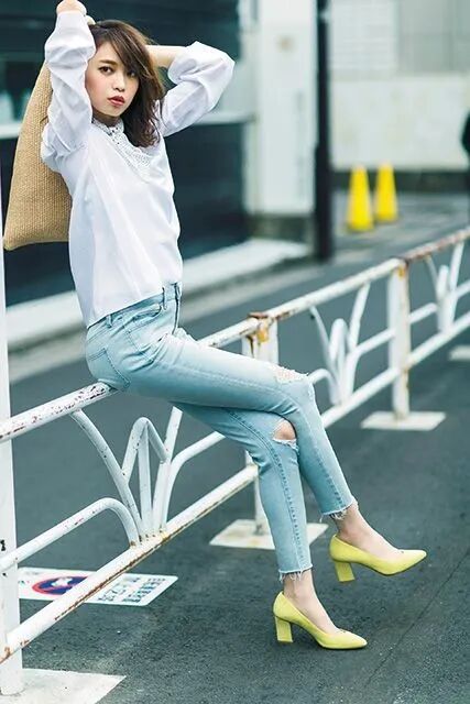 当然,优越品位不仅体现在衣服的选择上,细节之处更显精彩,搭配越简单,效果就越好。白色衬衫与浅色牛仔裤配色的确寡淡,可以配合色彩更加鲜亮的高跟鞋丰富色彩,这样一来既保留了搭配的优雅大方,同时又使时髦度更升一个level。