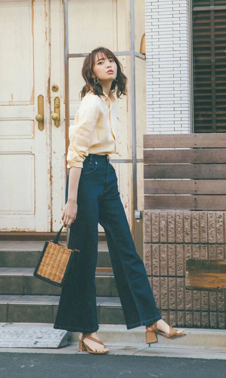 不过铅笔裤有一点不好,就是不能修饰腿型,若有点 X或O型腿趋势,倒不如选择更具修饰效果的微喇版型。微微开放的裤脚掩盖住膝盖到小腿的曲线,衬托得双腿笔直修长。同样采用高腰外穿的方式搭配白衬衫,简洁而有格调。