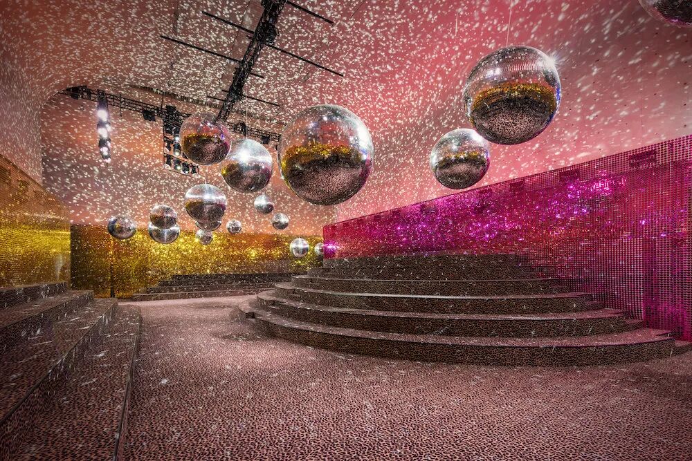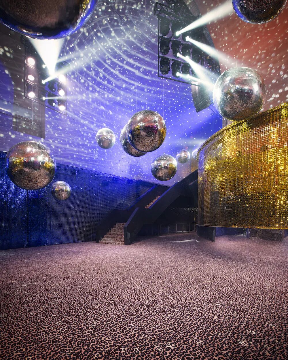 整个秀场被打造成巨大的迪斯科舞池,闪烁银色光芒的巨大迪斯科灯球,不规则地挂在天花板上,地毯和沙发都布满了 Dior 经典的豹纹元素,形成剧烈的视觉冲击感,像是一场狂野、欢乐的舞会,也与产品主题遥相呼应。