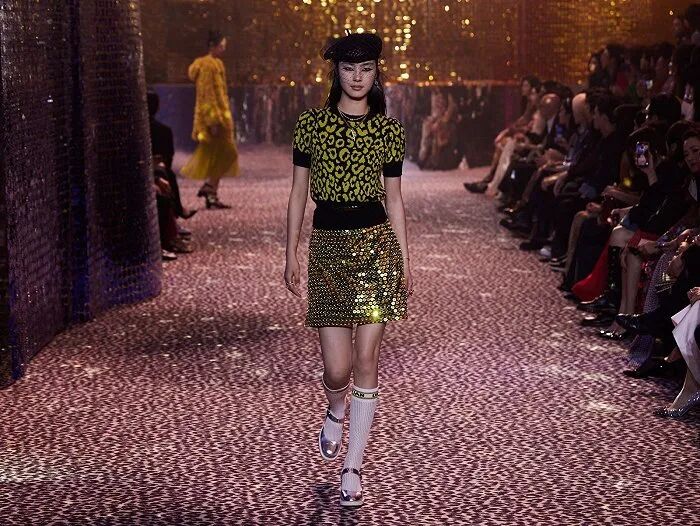 当怀旧色彩浓厚的电子舞曲响起时,在迪斯科球灯光的照射下,模特们身着豹纹和有着大面积亮片刺绣设计的服装徐徐走来,观众仿佛穿越回到了八十年代。