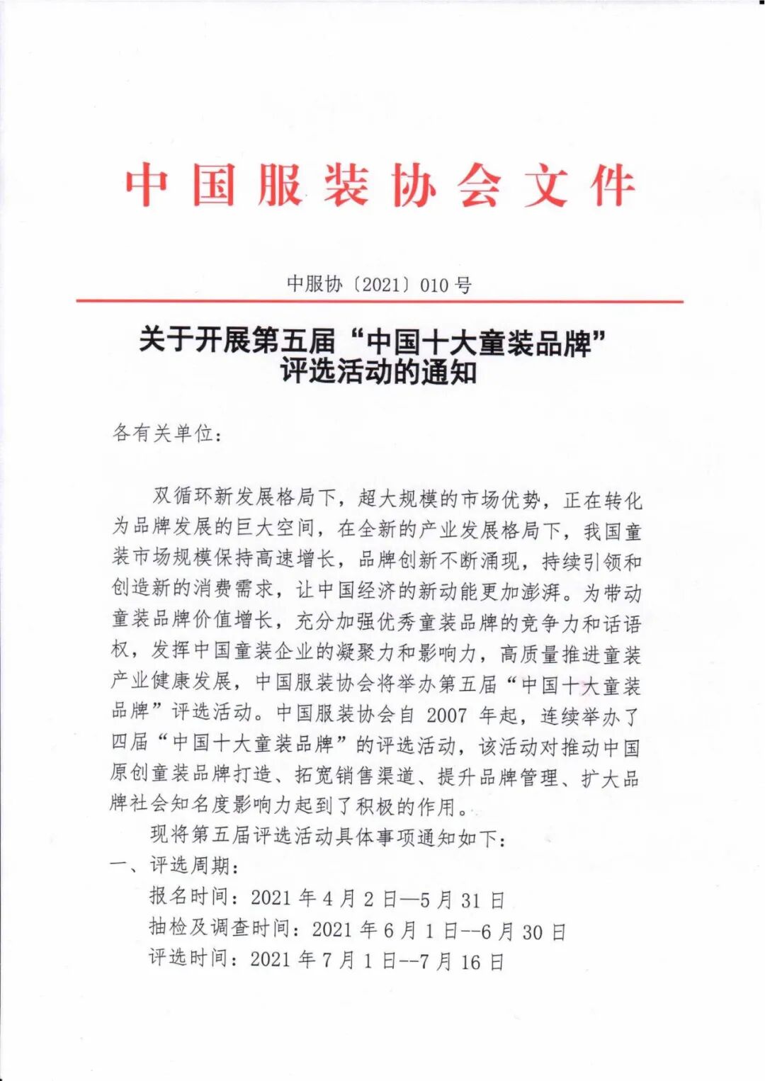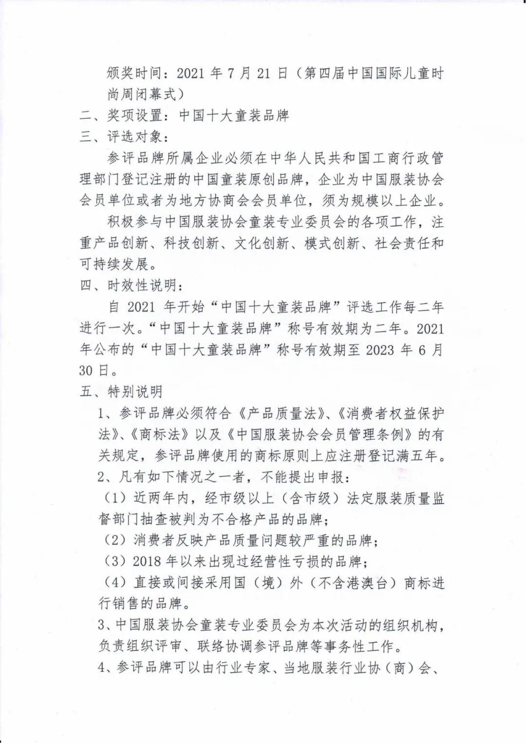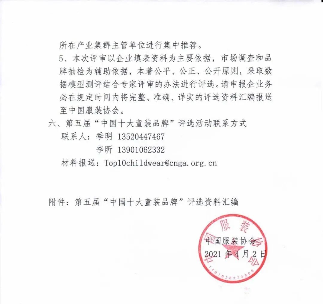 双循环新发展格局下,超大规模的市场优势,正在转化为品牌发展的巨大空间,在全新的产业发展格局下,我国童装市场规模保持高速增长,品牌创新不断涌现,持续引领和创造新的消费需求,让中国经济的新动能更加澎湃。为带动童装品牌价值增长,充分加强优秀童装品牌的竞争力和话语权,发挥中国童装企业的凝聚力和影响力,高质量推进童装产业健康发展,中国服装协会将举办第五届“中国十大童装品牌”评选活动。中国服装协会自2007年起,连续举办了四届“中国十大童装品牌”的评选活动,该活动对推动中国原创童装品牌打造、拓宽销售渠道、提升品牌管理、扩大品牌社会知名度影响力起到了积极的作用。颁奖时间:2021年7月21日(第四届中国国际儿童时尚周闭幕式)参评品牌所属企业必须在中华人民共和国工商行政管理部门登记注册的中国童装原创品牌,企业为中国服装协会会员单位或者为地方协商会会员单位,须为规模以上企业。积极参与中国服装协会童装专业委员会的各项工作,注重产品创新、科技创新、文化创新、模式创新、社会责任和可持续发展。自2021年开始“中国十大童装品牌”评选工作每二年进行一次。“中国十大童装品牌”称号有效期为二年。2021年公布的“中国十大童装品牌”称号有效期至2023年6月30日。1、参评品牌必须符合《产品质量法》、《消费者权益保护法》、《商标法》以及《中国服装协会会员管理条例》的有关规定,参评品牌使用的商标原则上应注册登记满五年。 (1)近两年内,经市级以上(含市级)法定服装质量监督部门抽查被判为不合格产品的品牌; (4)直接或间接采用国(境)外(不含港澳台)商标进行销售的品牌。 3、中国服装协会童装专业委员会为本次活动的组织机构,负责组织评审、联络协调参评品牌等事务性工作。4、参评品牌可以由行业专家、当地服装行业协(商)会、所在产业集群主管单位进行集中推荐。5、本次评审以企业填表资料为主要依据,市场调查和品牌抽检为辅助依据,本着公平、公正、公开原则,采取数据模型测评结合专家评审的办法进行评选。请申报企业务必在规定时间内将完整、准确、详实的评选资料汇编报送至中国服装协会。材料报送:Top10childwear@cnga.org.cn1、获取链接:https://pan.baidu.com/s/16CHDYX1vw7mnQlAlqdLMog