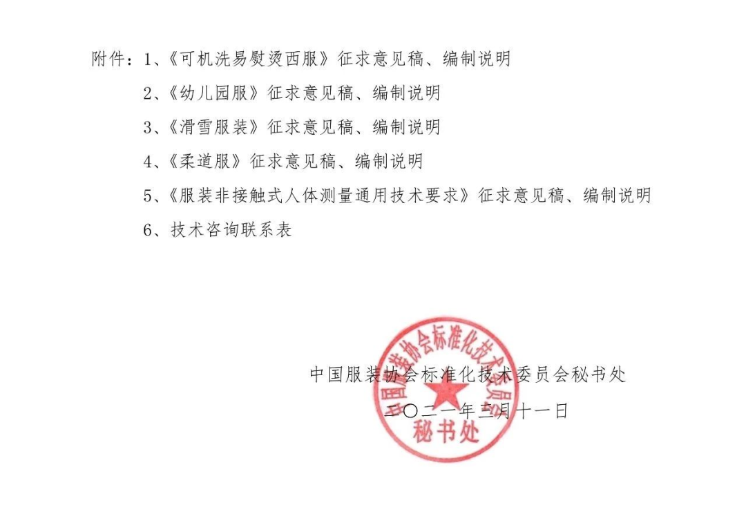 关于对《可机洗易熨烫西服》等5项团体标准征求意见的通知团体标准《可机洗易熨烫西服》等5项计划项目已完成征求意见稿(见附件),现发送给各位委员、专家进行意见征求。请各专家、委员及时填写技术咨询联系表,认真组织有关技术人员对标准征求意见稿进行研究和讨论,并将讨论意见汇总后,于2021年4月12日前将技术咨询联系表反馈至中国服装协会标准化技术委员会秘书处,也可通过中国服装协会团体标准工作平台(http://www.cnga.org.cn/html/2020bzyzl/),点击“CNGA团体标准征求意见”进行提交。邮 箱(E-mail):fzbwh@163.com5、《服装非接触式人体测量通用技术要求》征求意见稿、编制说明https://pan.baidu.com/s/1F9ndlW8yBykwrt0rB1sNOg 提取码: 4ywm