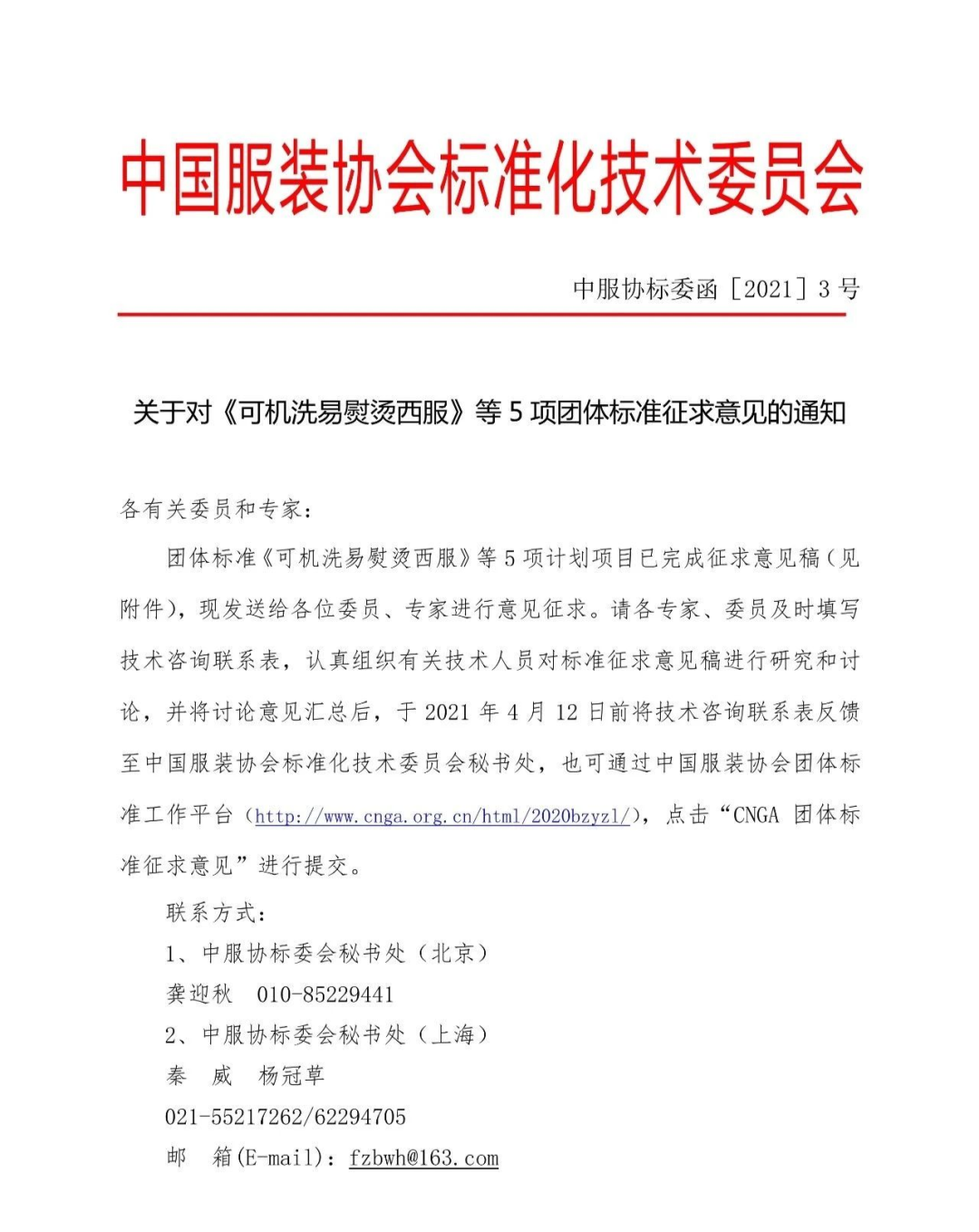 点击蓝字关注我们关于对《可机洗易熨烫西服》等5项团体标准征求意见的通知中服协标委...