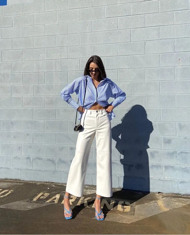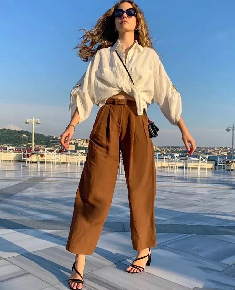 阔腿裤真的是万能百搭单品,想要在搭配衬衫的时候,想要更加有出彩的效果,就可以看看最近特别流行的一种阔腿裤的长度,那就是很常见但是不普通的九分的长度,和衬衫搭配更有感觉。