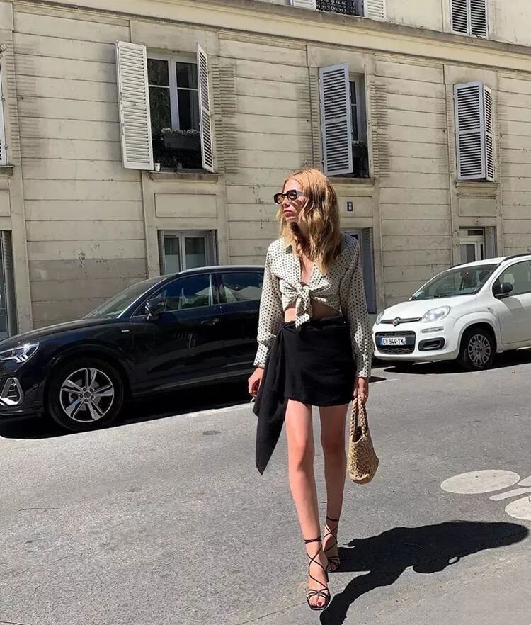 小短裙搭配上衬衫就是利用了"上短下长"的组合,这里的"下长"指的是腿部露出面积比较大,这个巧妙了,可以在悄无声息之间转移人们的视线,起到一个瘦腰的效果。