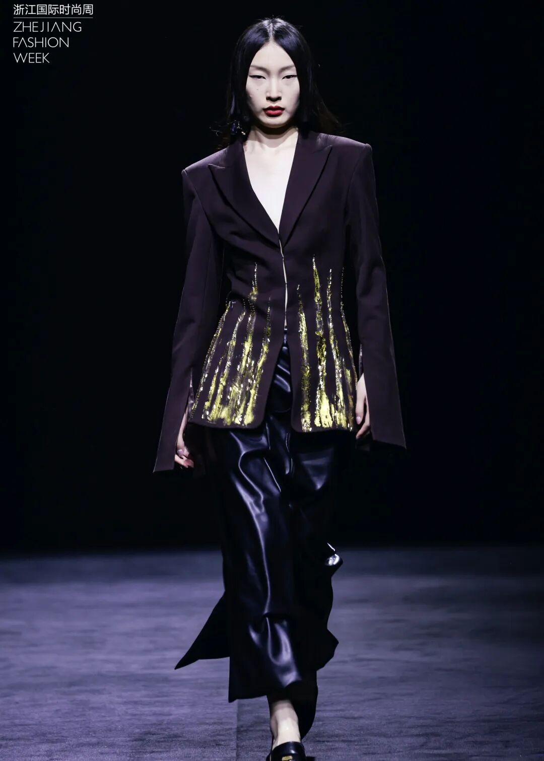 设计灵感来源于生态热点已然成为消费与时尚前沿,竹纤维面料具有柔滑暖软、透气抗菌、天然保健等特点,是真正意义上的绿色环保面料,故想使用竹纤维绿色环保面料传递一种永续时尚理念。“竹集”系列贯用竹纤维面料与主元素花型图案,将竹子融入镂空绣花、珠片绣花、写意刺绣、层次提花、手工钉钻等工艺中,在沉稳西装中融入精致生动的细节,形成独特的审美格调。极简主义的破与立结合,表达出张弛有度的自信力量。竹元素的强调,不仅是对生态面料的诠释,也是对独立坚定灵魂的追寻,希望当代青年能探寻到完满的灵魂共鸣,在无论哪种境地中独立身姿,信仰自由。