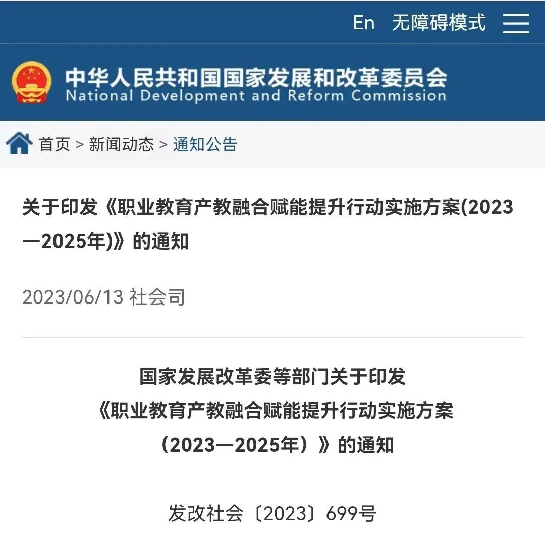 国家发展改革委、教育部等8部门近日联合印发《职业教育产教融合赋能提升行动实施...